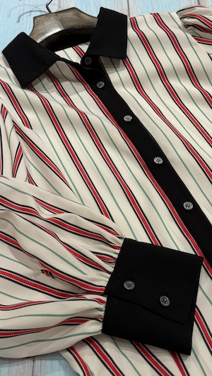 ちょっとレトロな配色ストライプに、やや光沢感のあるとろみの生地が大人っぽいシャツブラウス