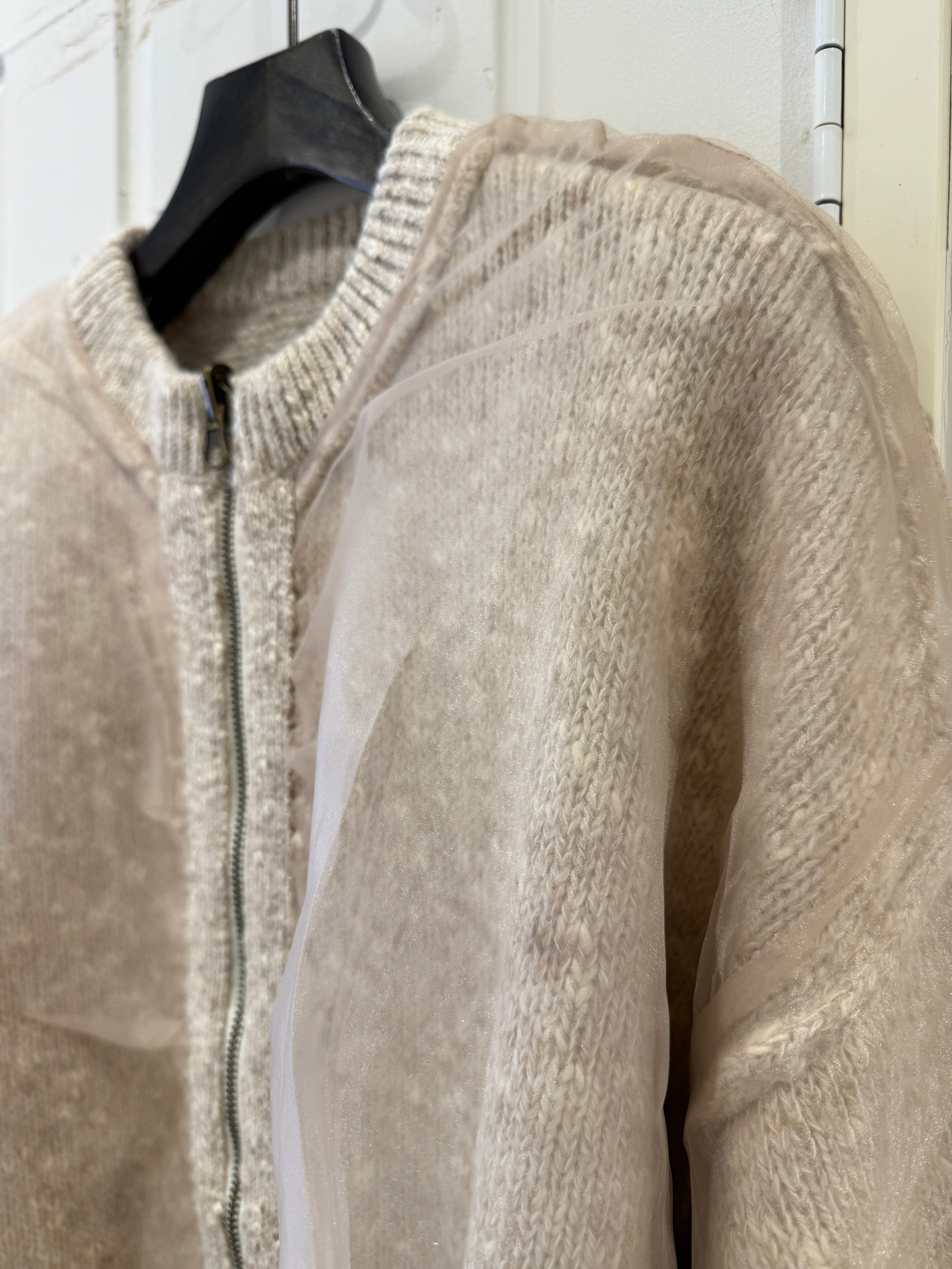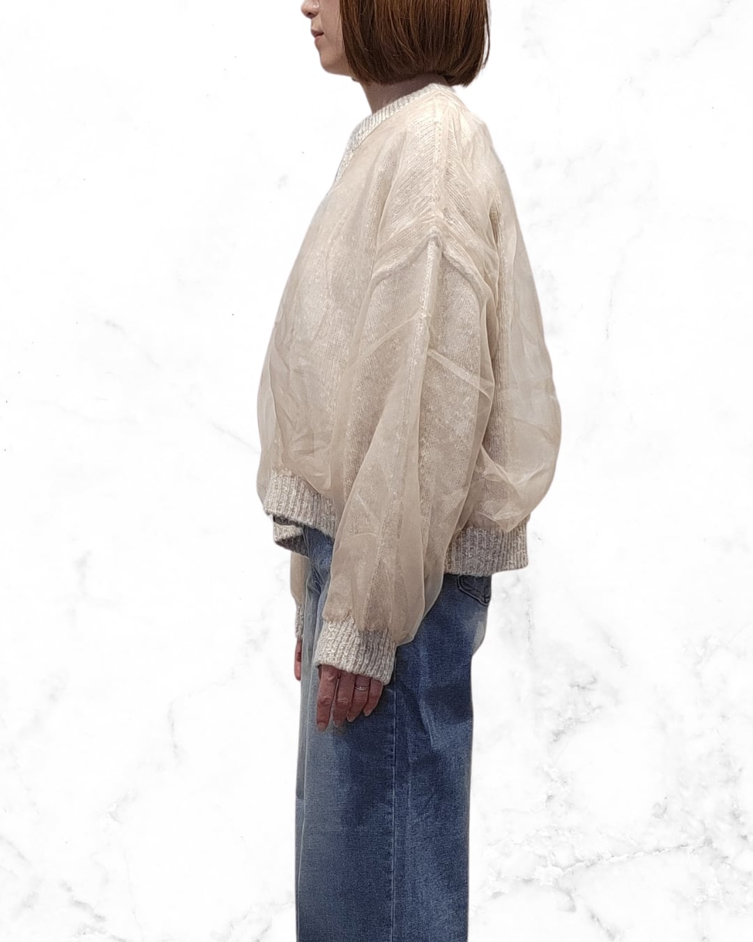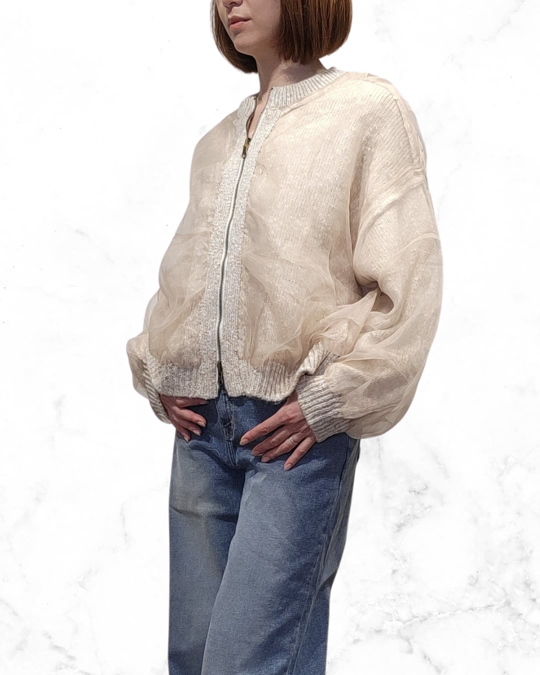 ベージュをベースとしたMIXカラーのニットカーディガンに、同系色のオーガンジーをまとったとても女性らしい上品なアイテム