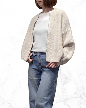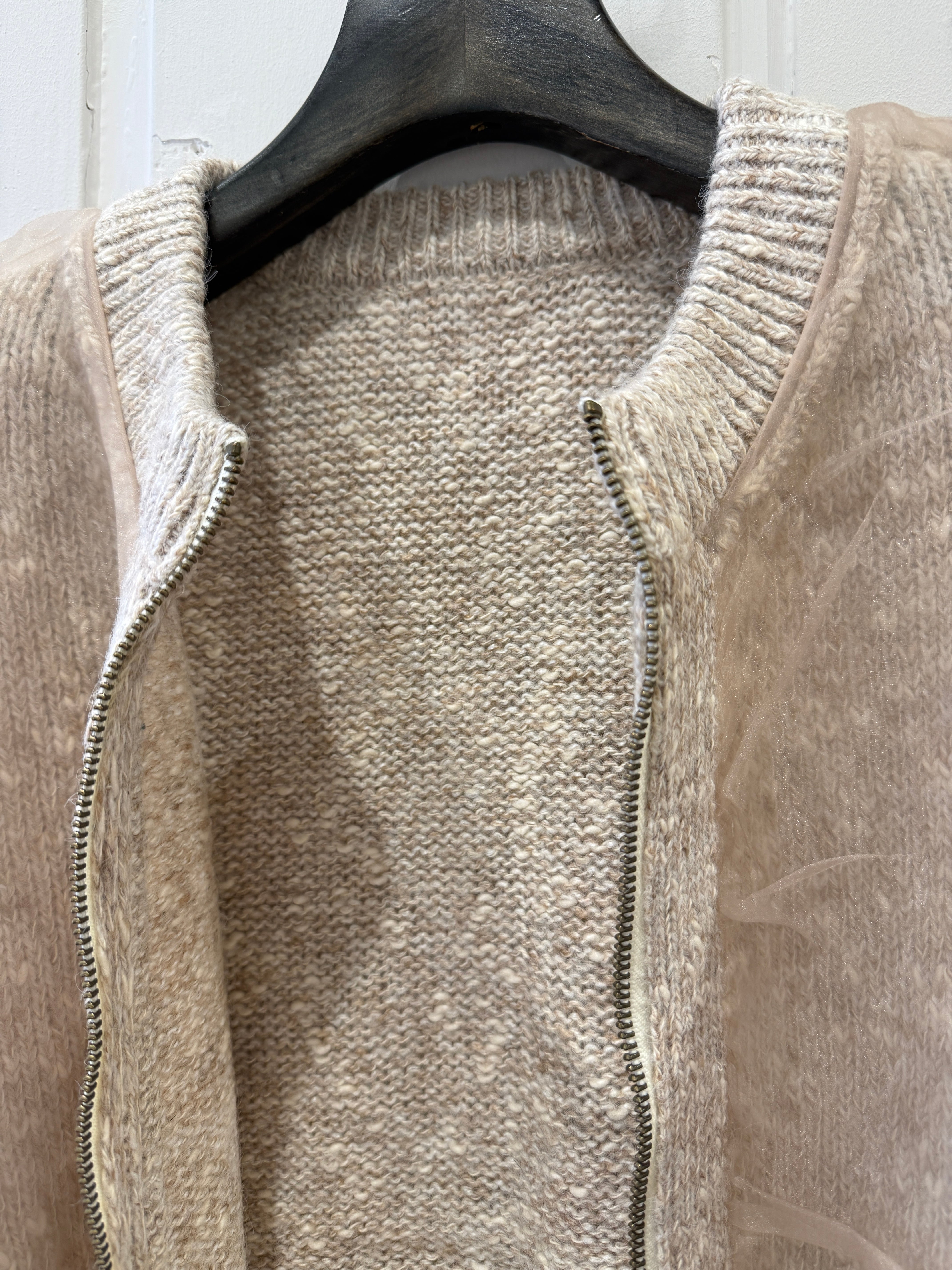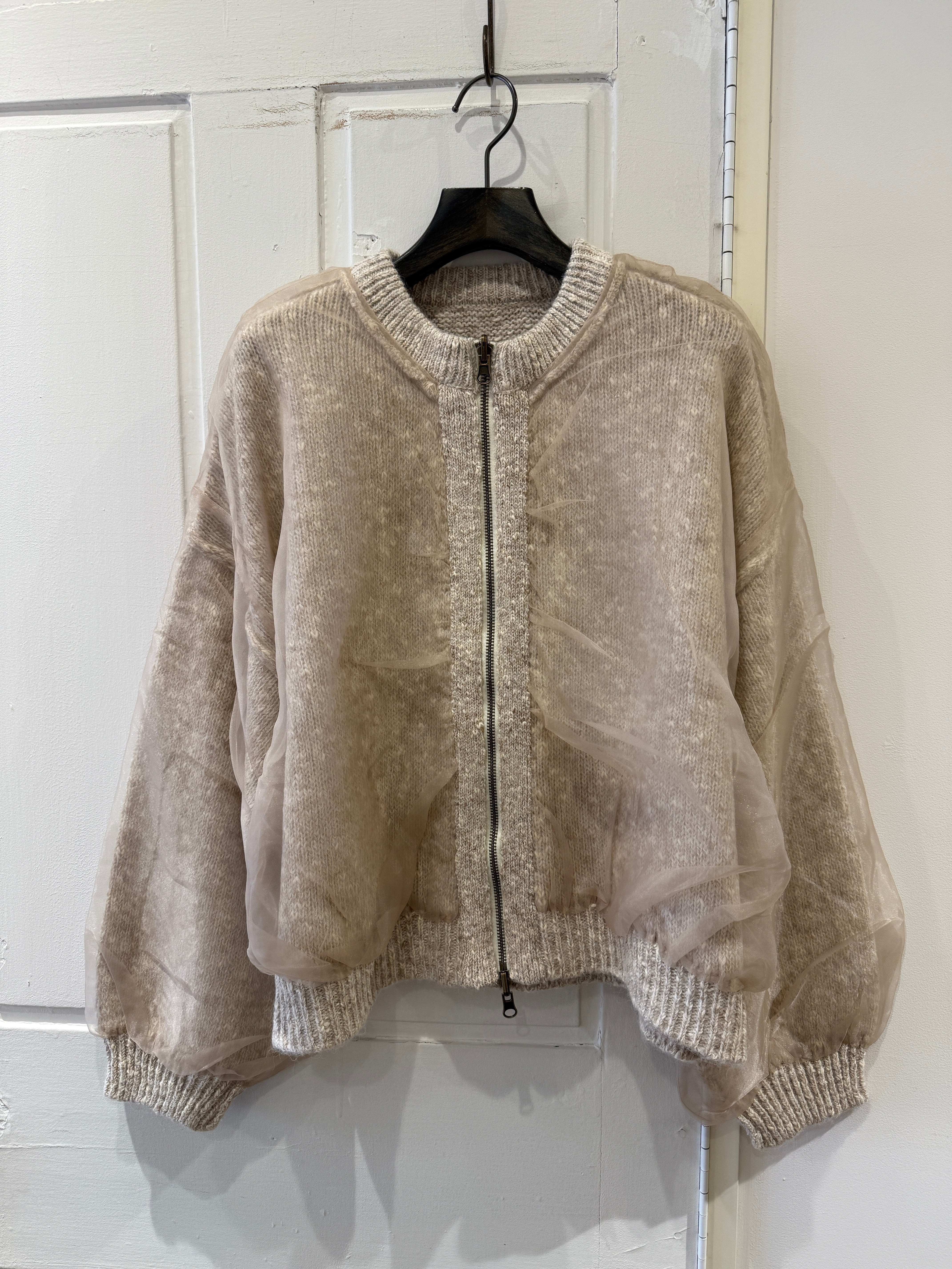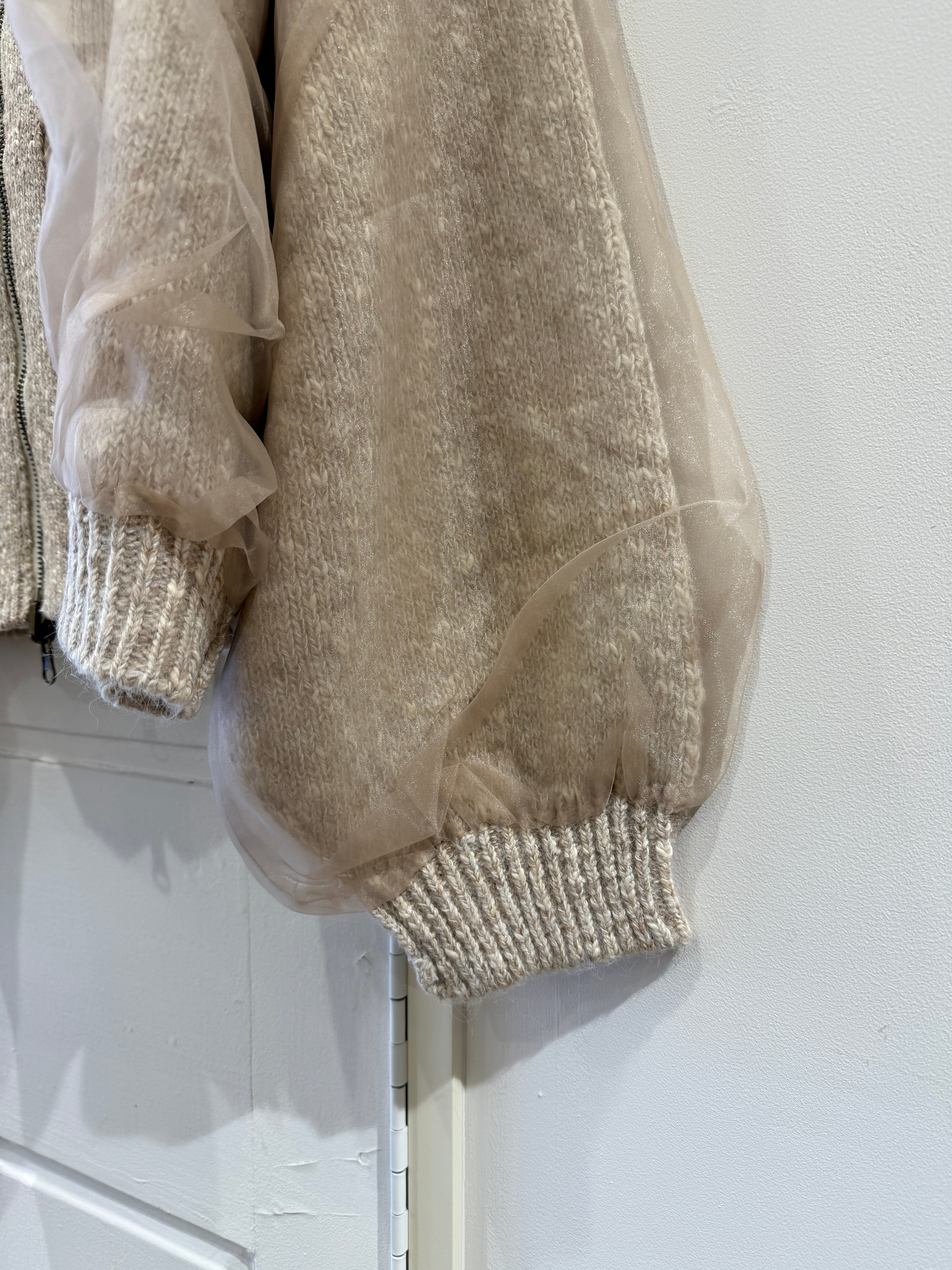 ベージュをベースとしたMIXカラーのニットカーディガンに、同系色のオーガンジーをまとったとても女性らしい上品なアイテム