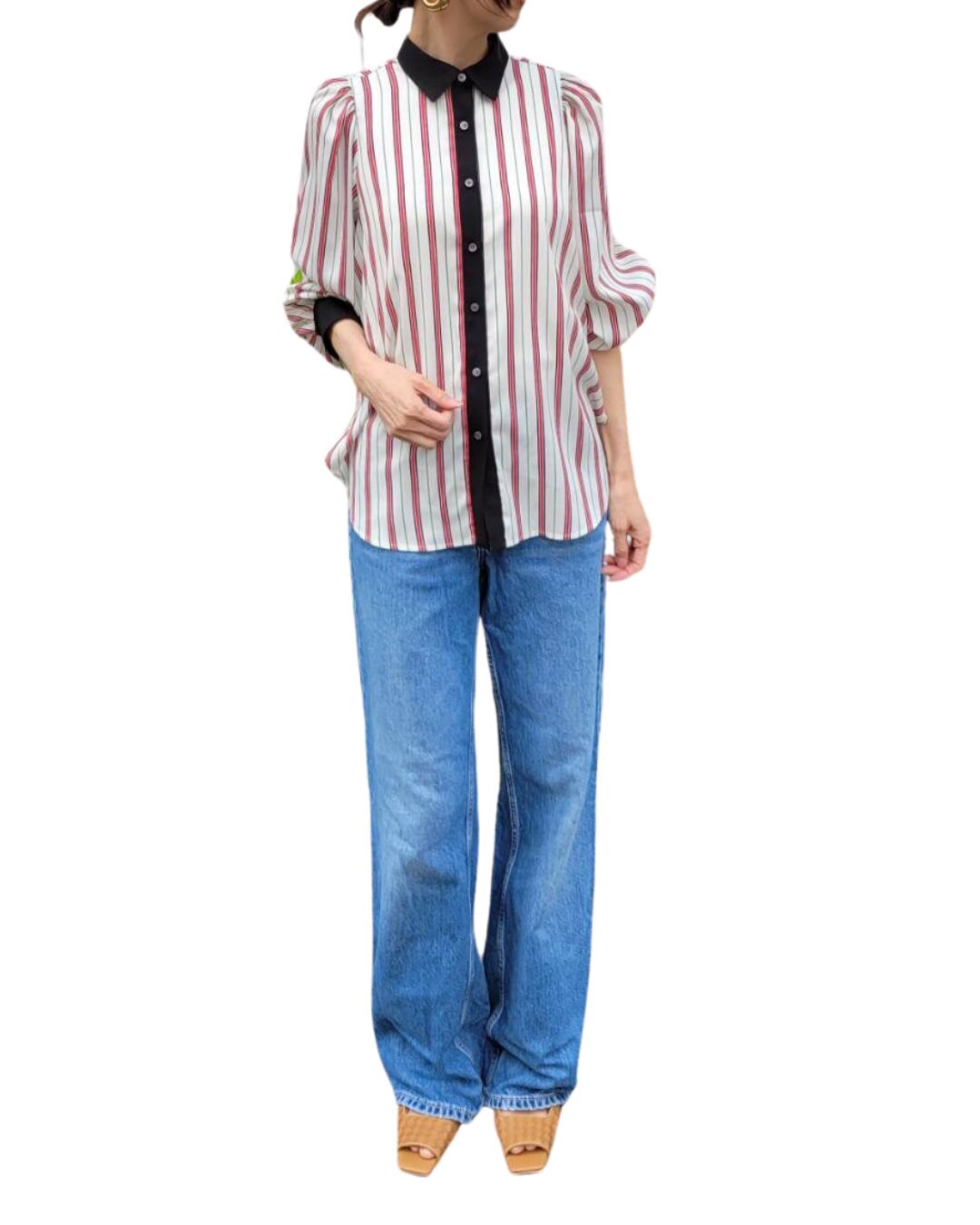 ちょっとレトロな配色ストライプに、やや光沢感のあるとろみの生地が大人っぽいシャツブラウス