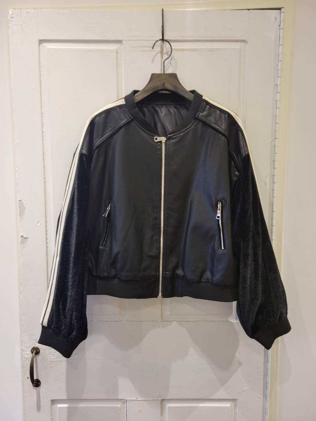 女性らしいややラメ感のある袖・背面下部の生地と、メンズライクな合皮をドッキングさせたショート丈ブルゾン