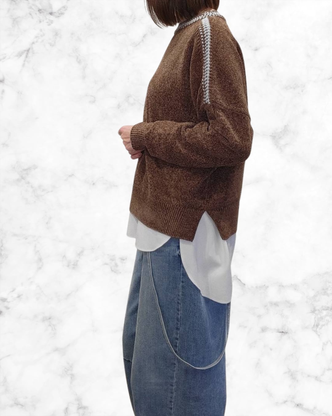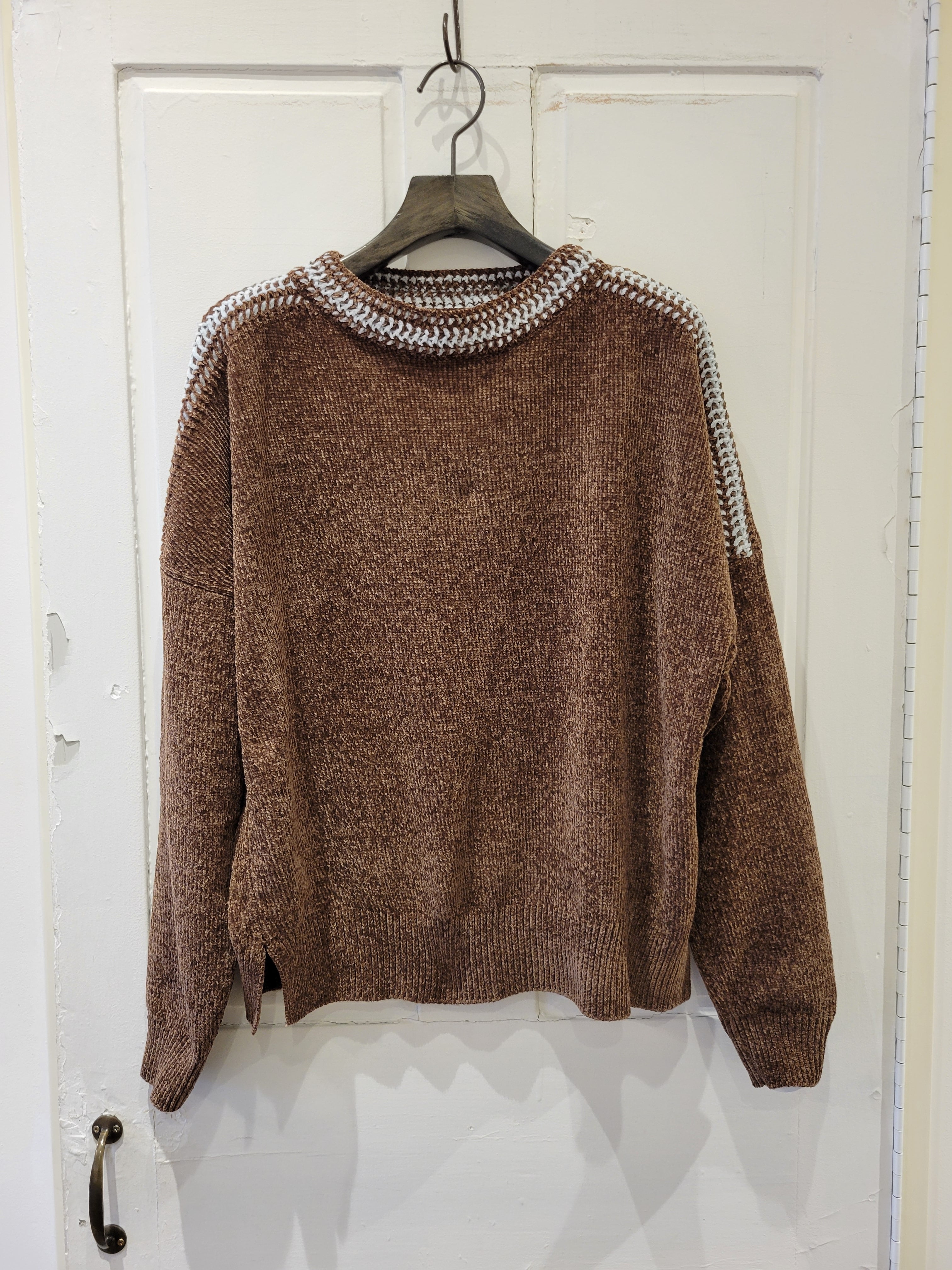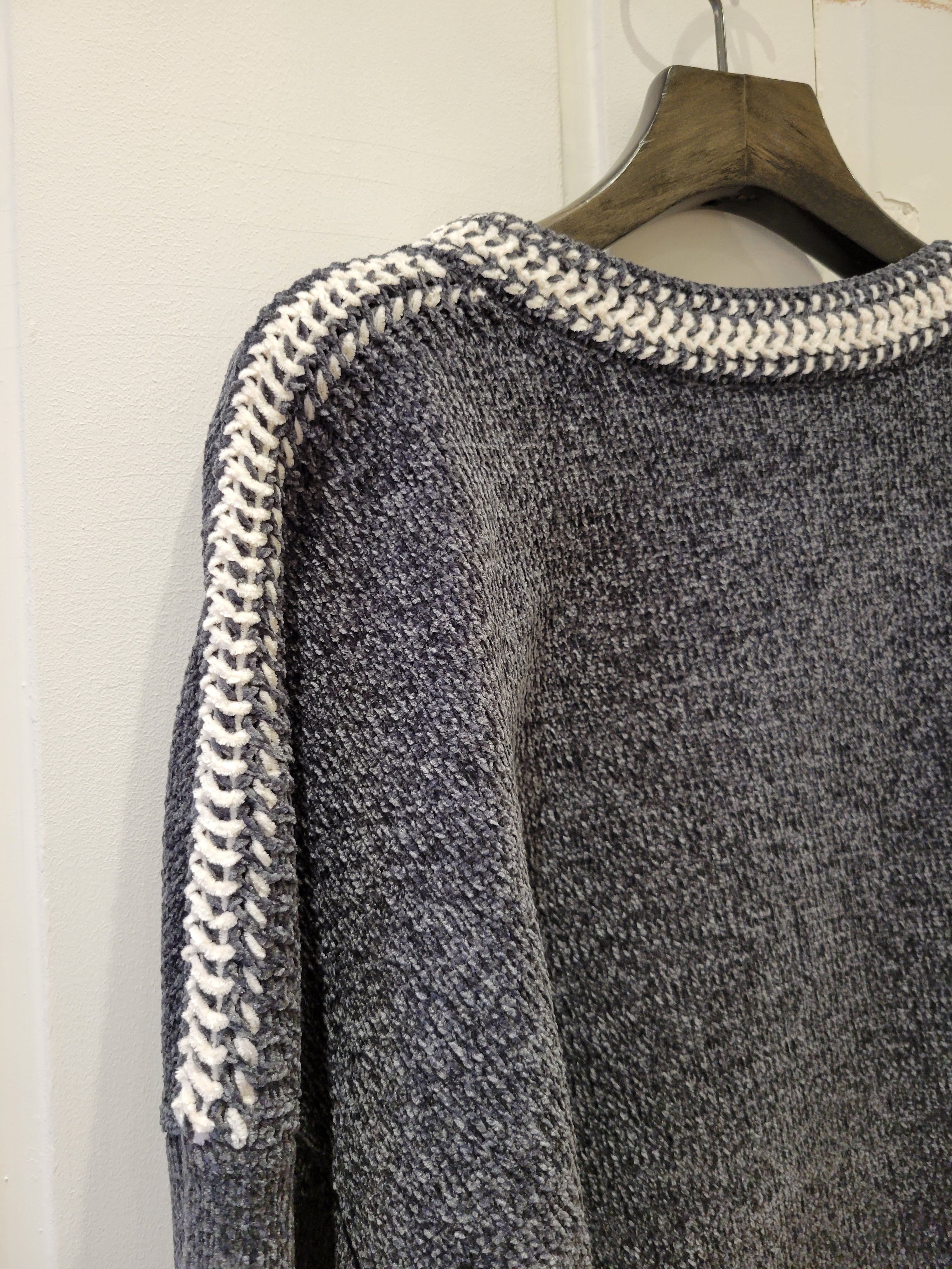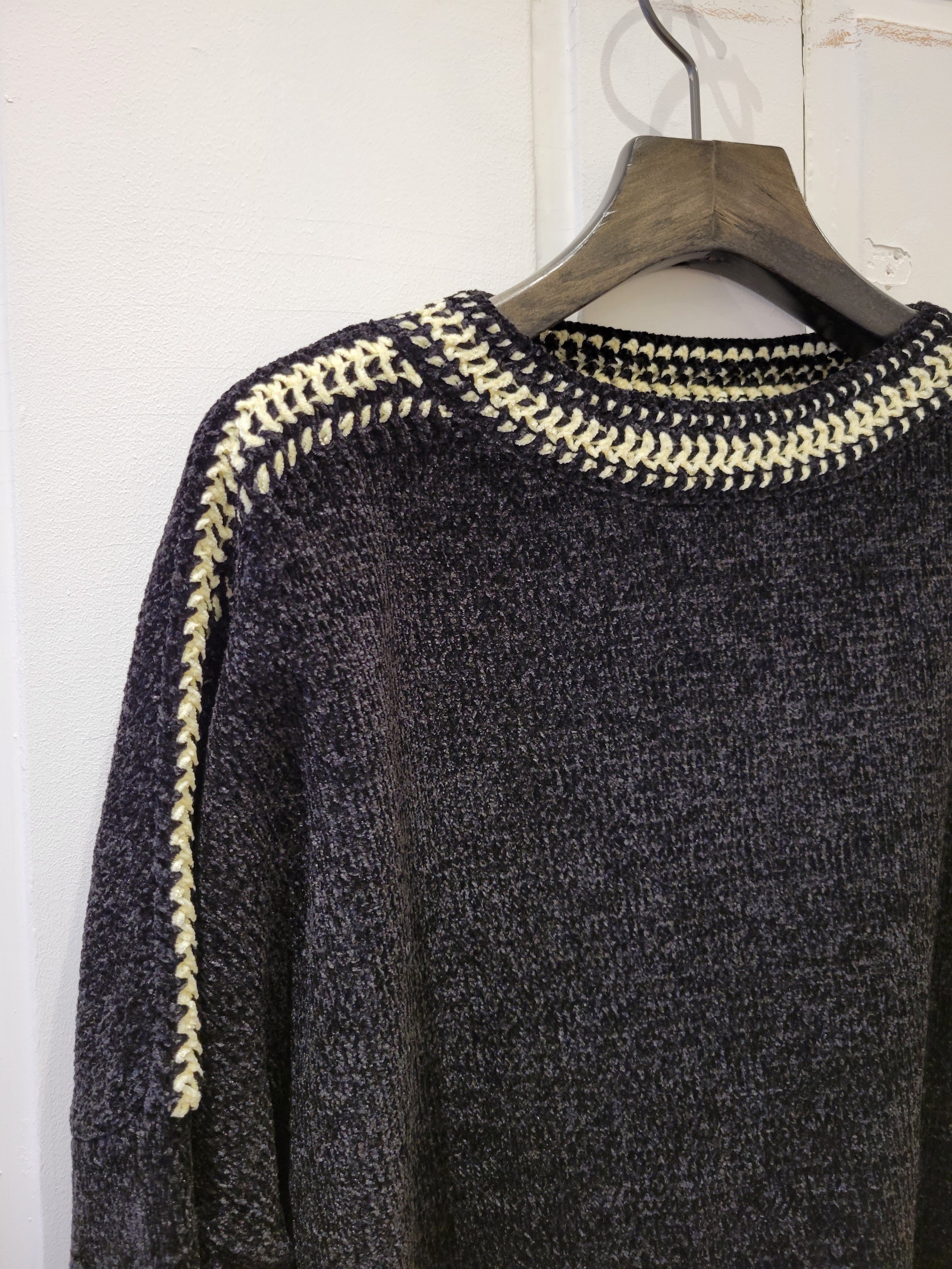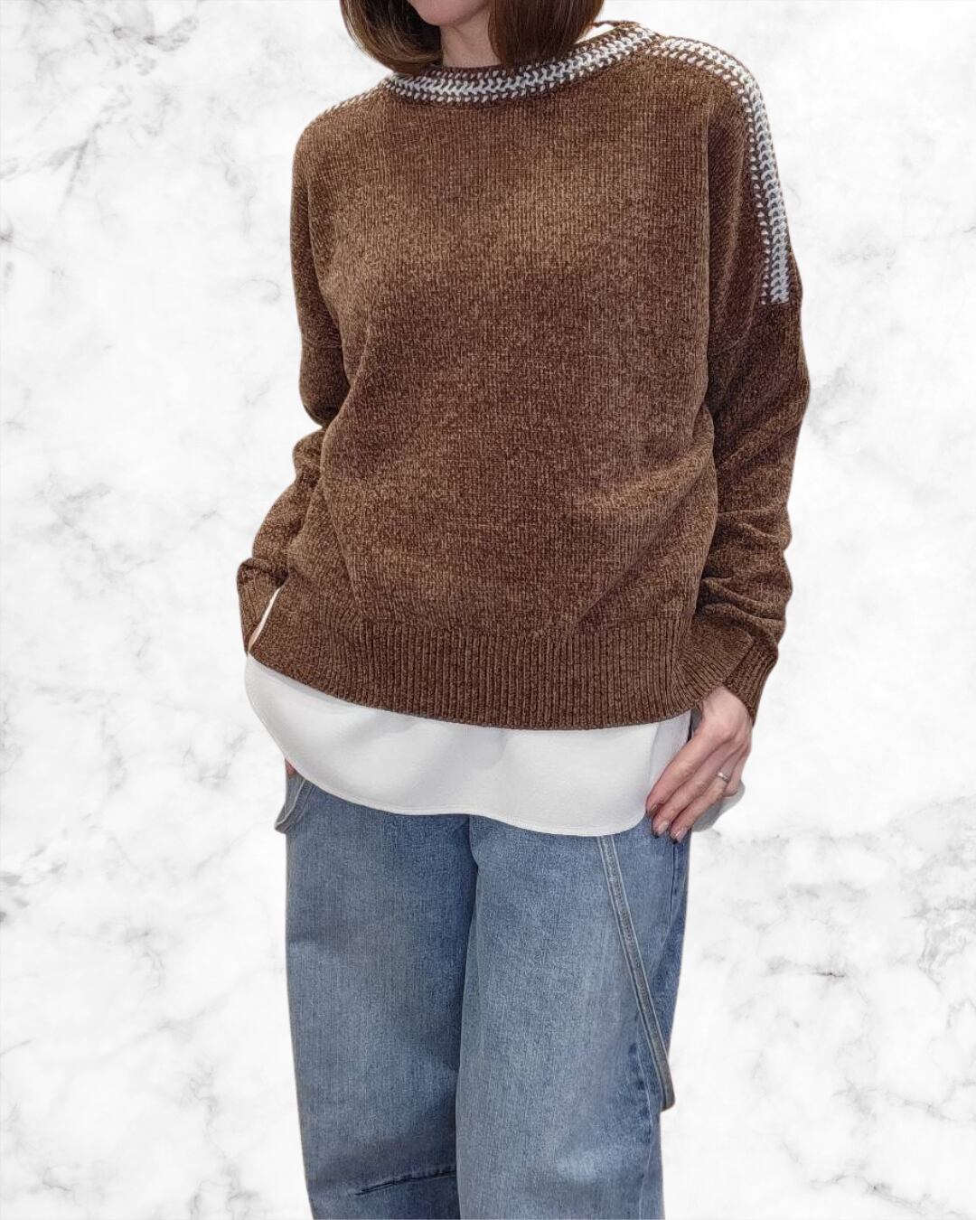 カジュアル見えするモールニットの首まわりと肩に、ざっくりしたステッチ編みを施した、配色の効いたプルオーバー