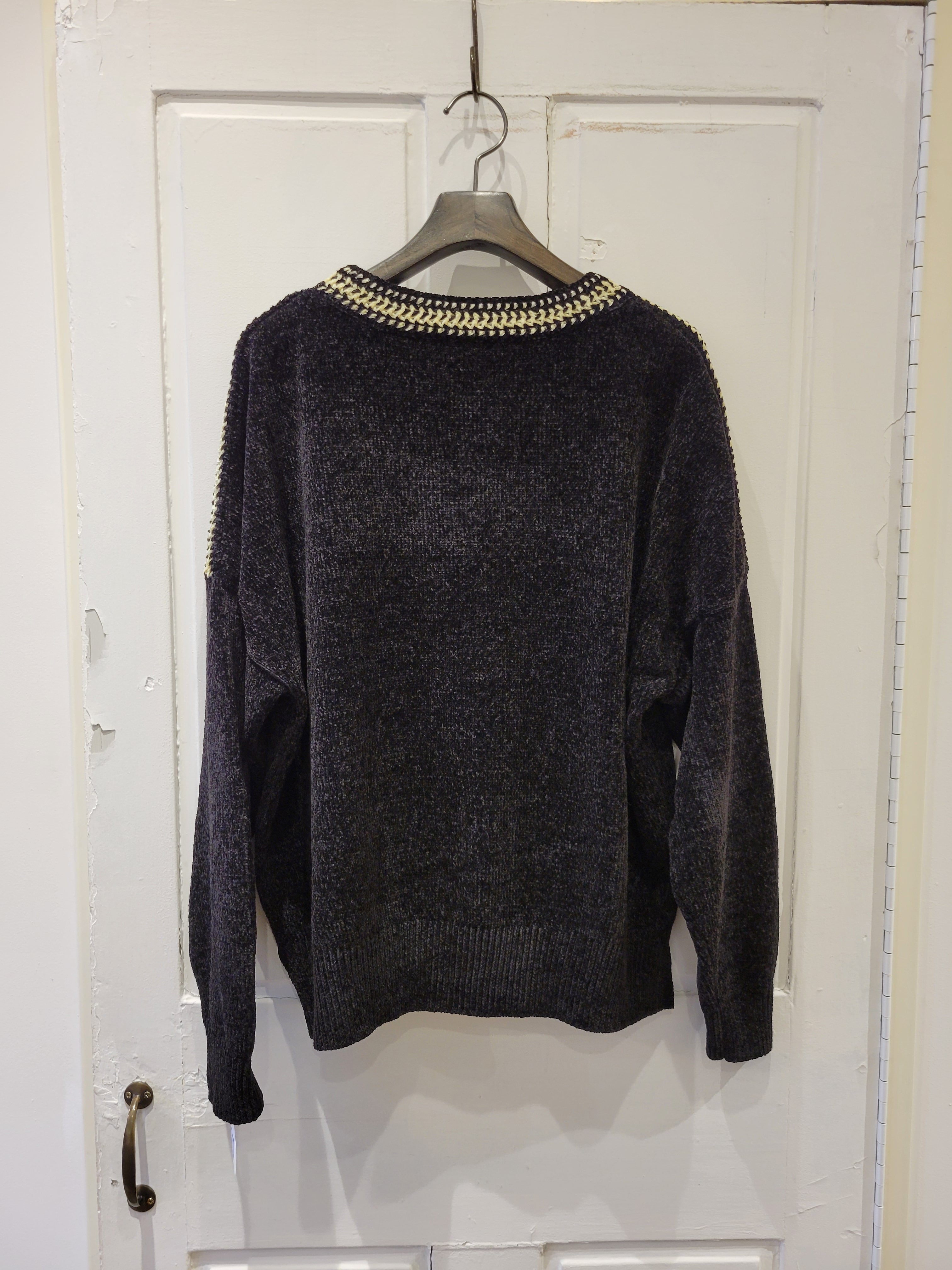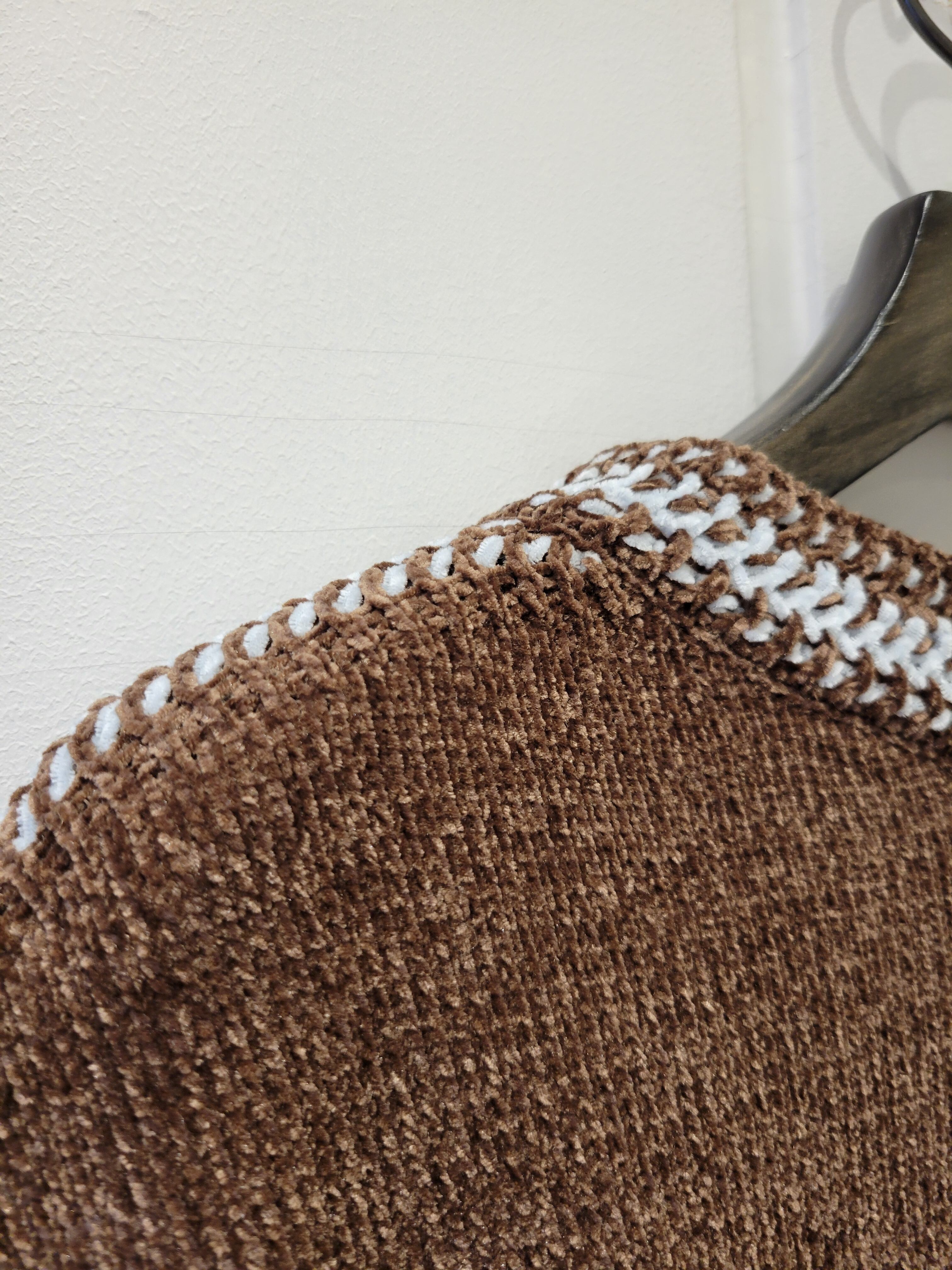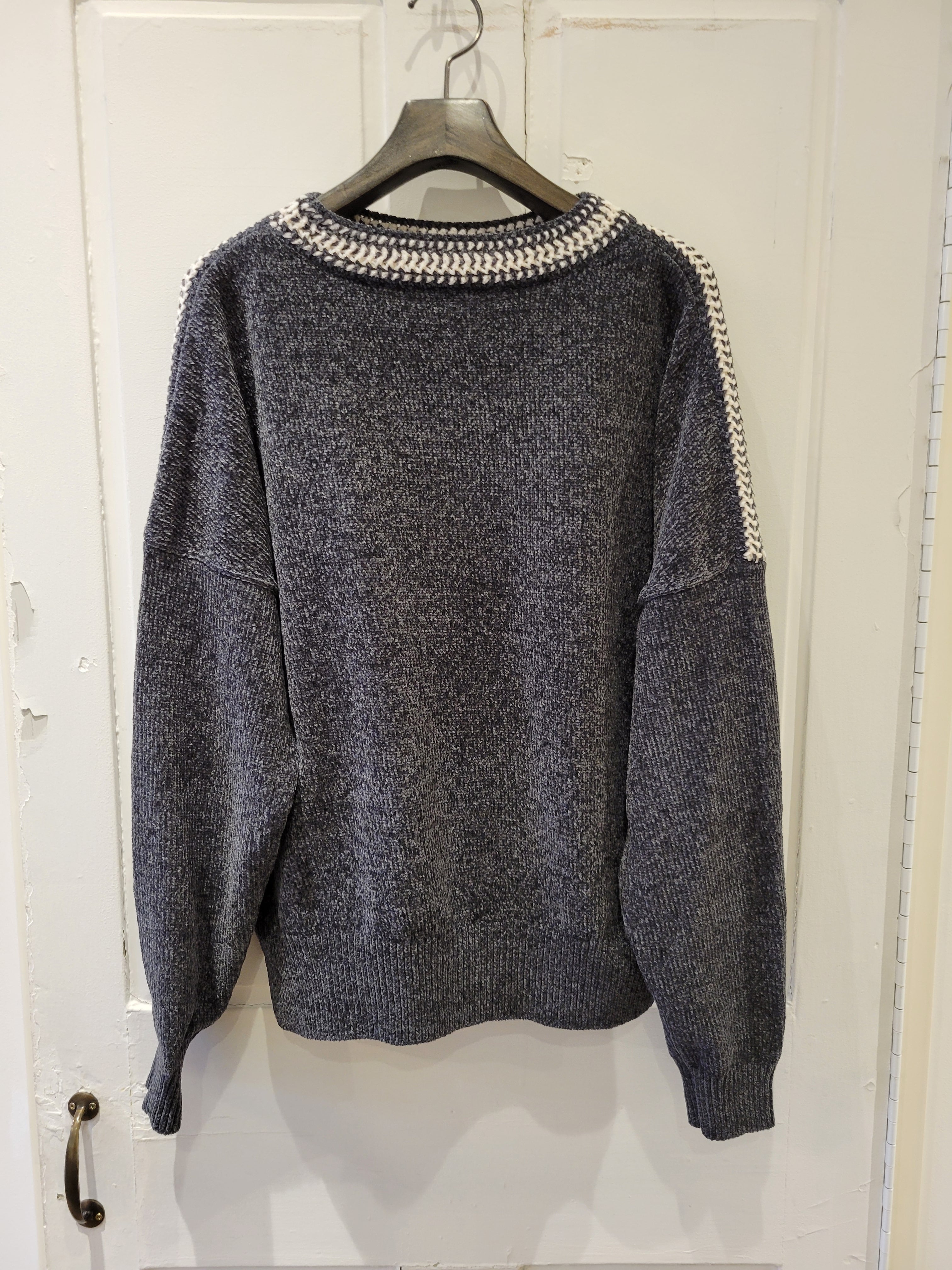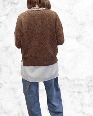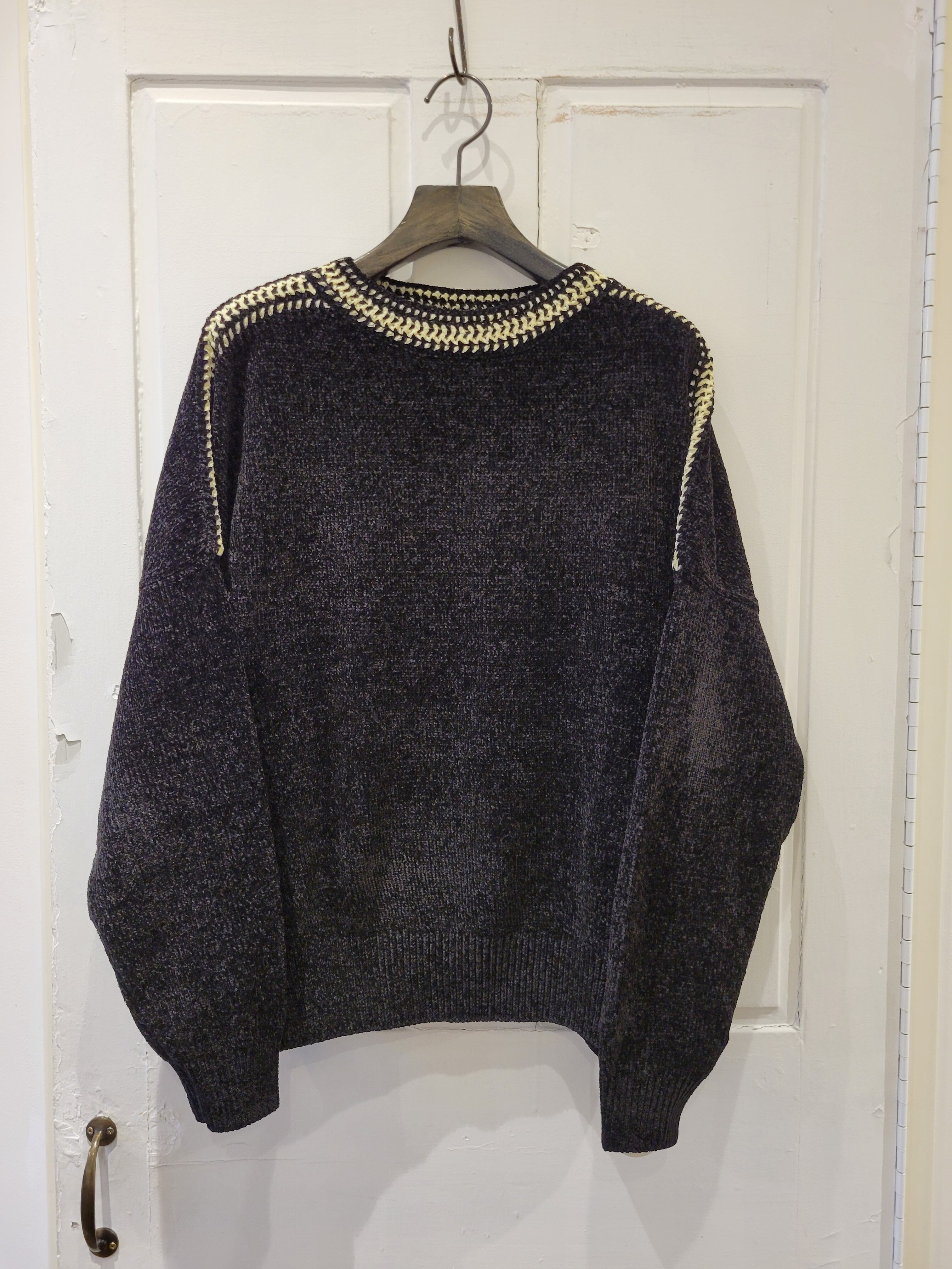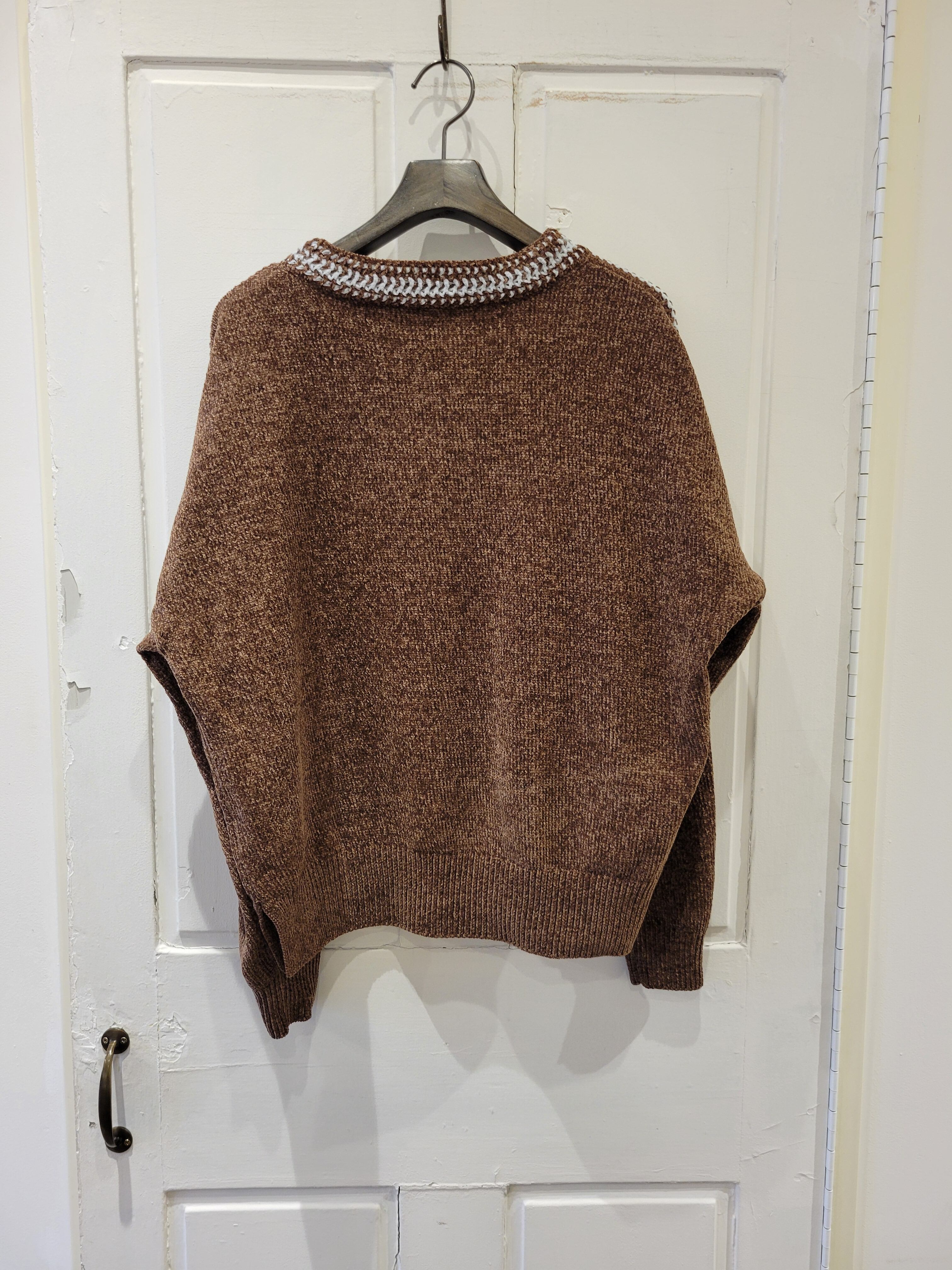 カジュアル見えするモールニットの首まわりと肩に、ざっくりしたステッチ編みを施した、配色の効いたプルオーバー