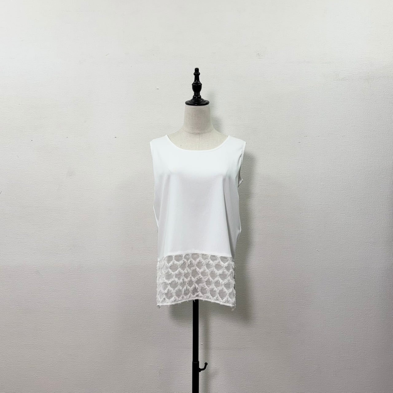 身頃部分はカットソー、裾部分はフリンジジャガードで異素材切り替えされたデザインタンクトップ。