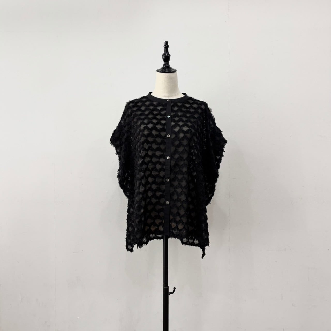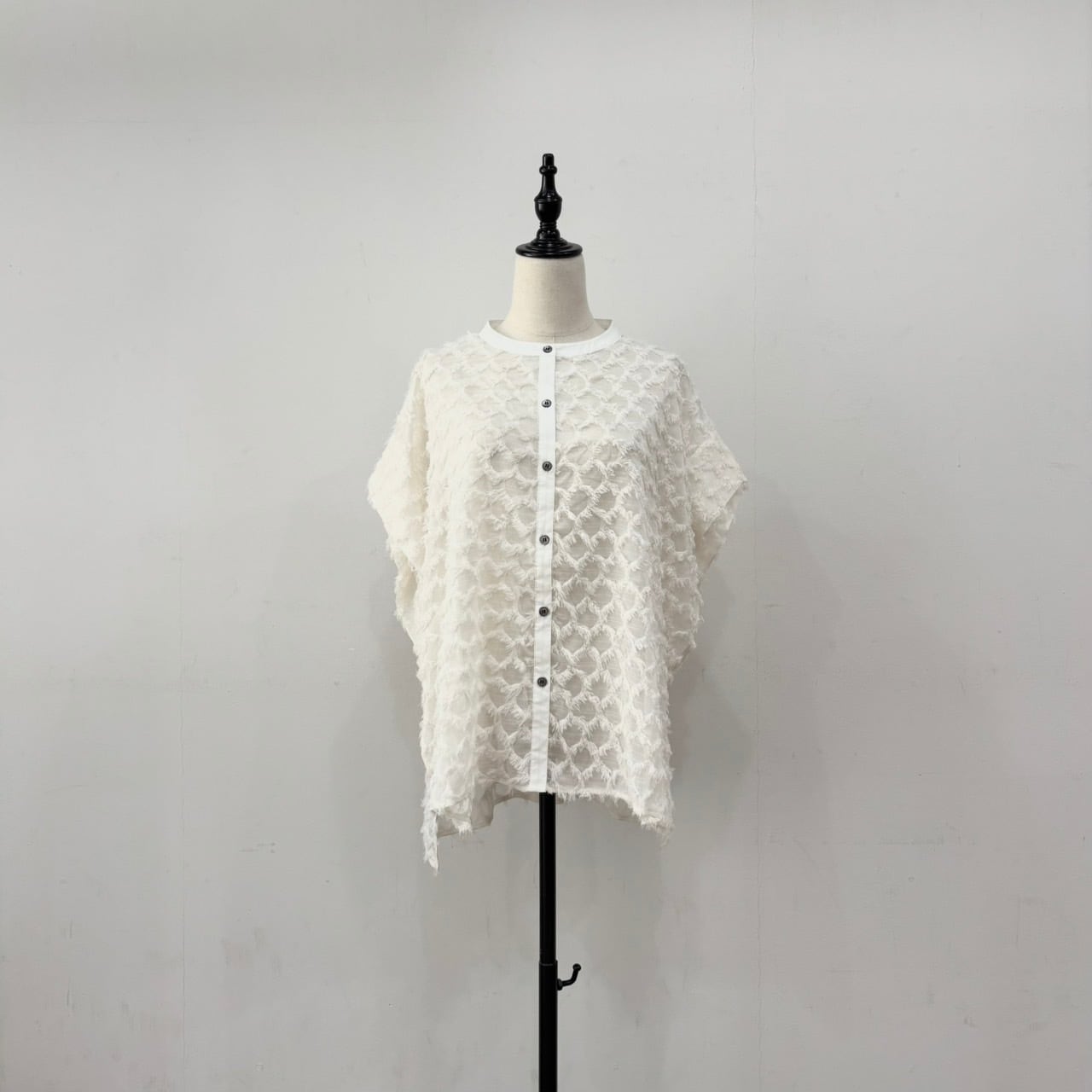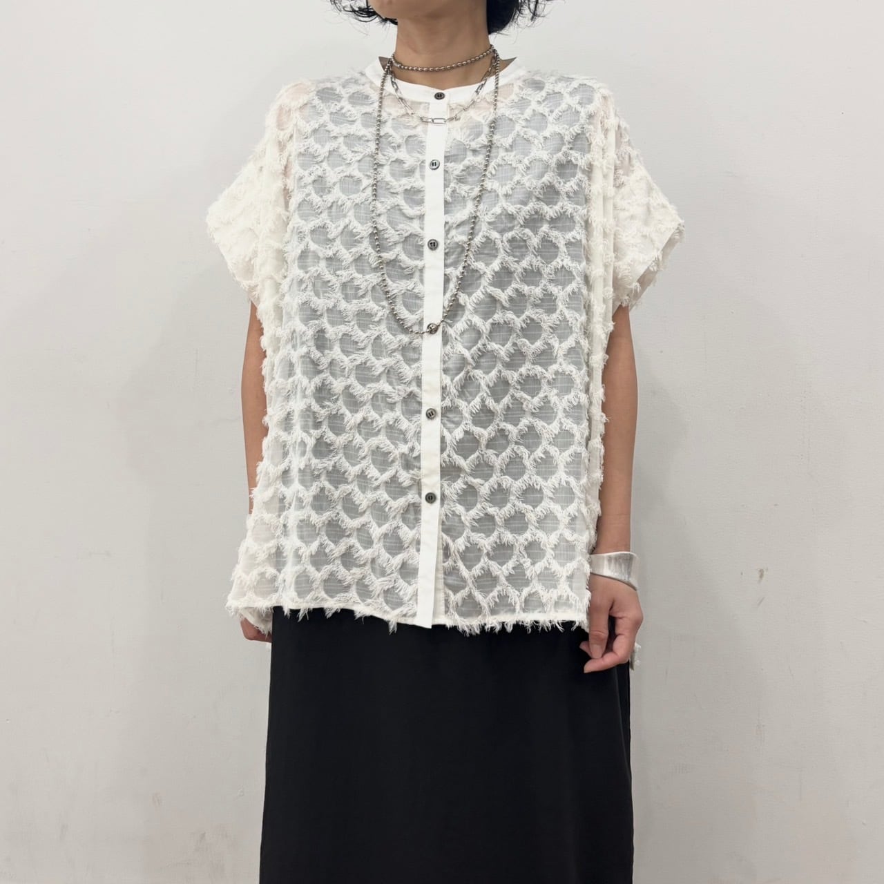 袖部分をタックにすることで、二の腕をカバーすることができるフレンチスリーブのデザインシャツ。立体感のあるフリンジジャガードで1枚で存在感のあるアイテムになります。