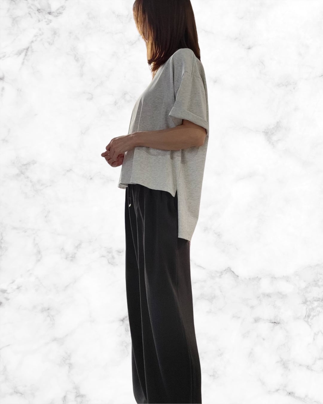 前後差のあるデザインで、前はすっきりしながらもヒップを覆う安心の丈感が嬉しいですね