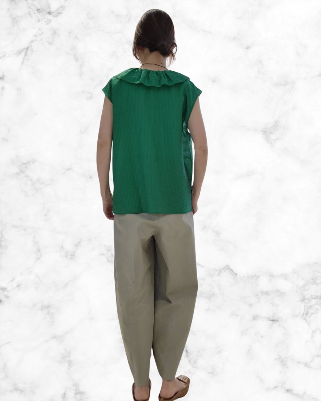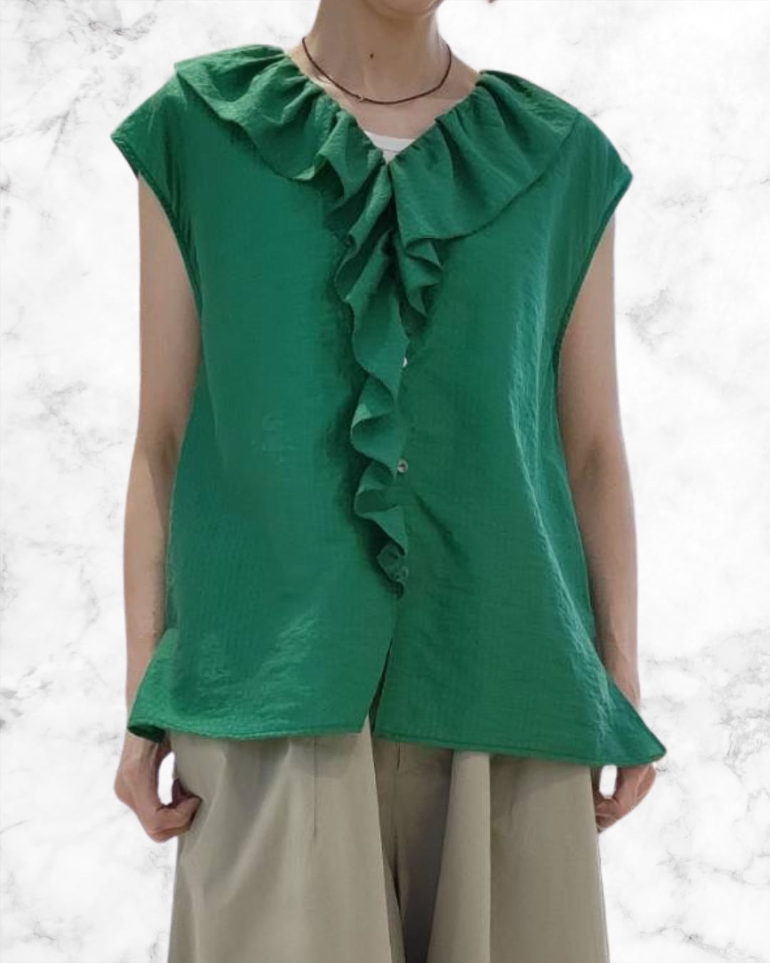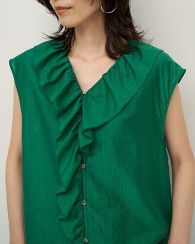 フリルは甘くなりすぎないようバランスにこだわり、大人の方でも取り入れやすいデザインに。フリルの端はピコミシンで仕上げ、さりげない華奢さをプラスしています。