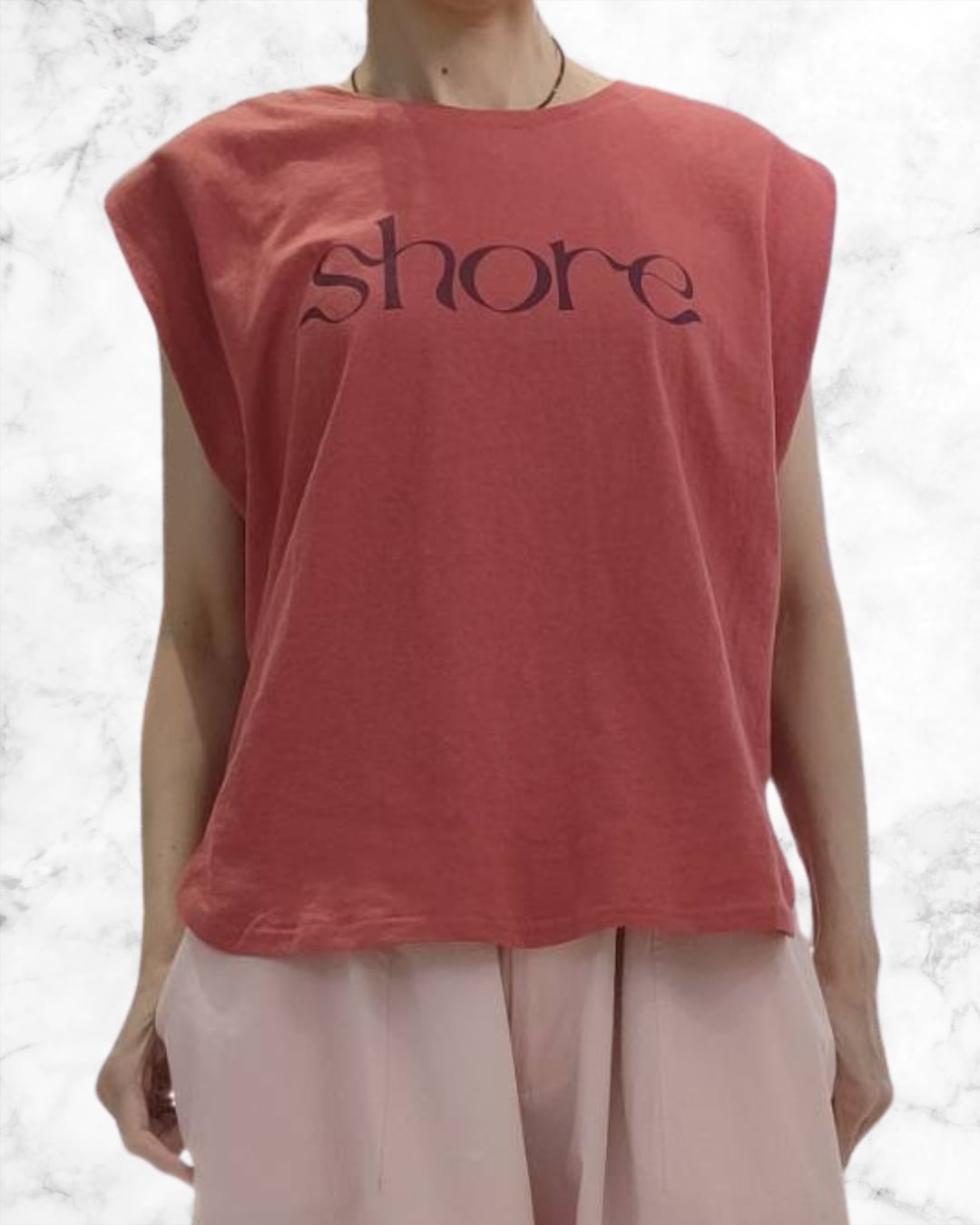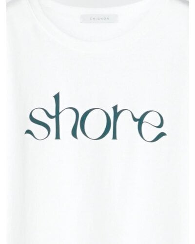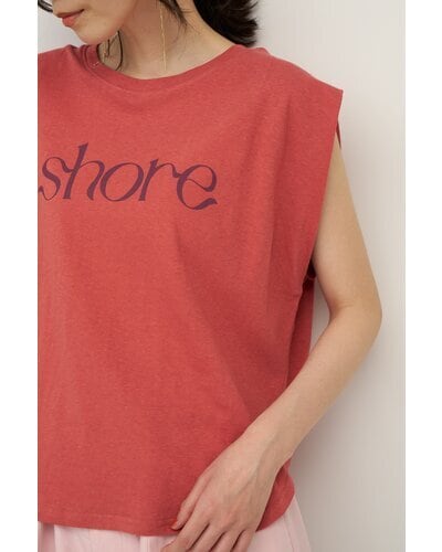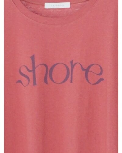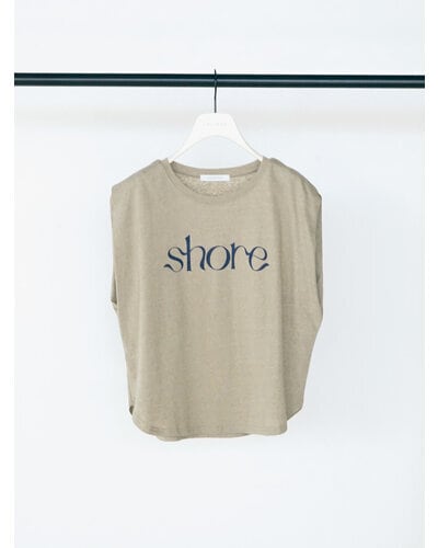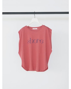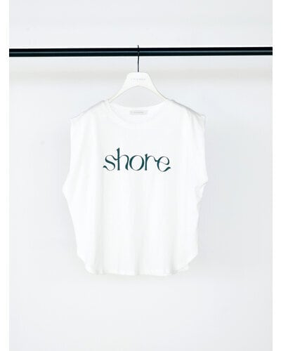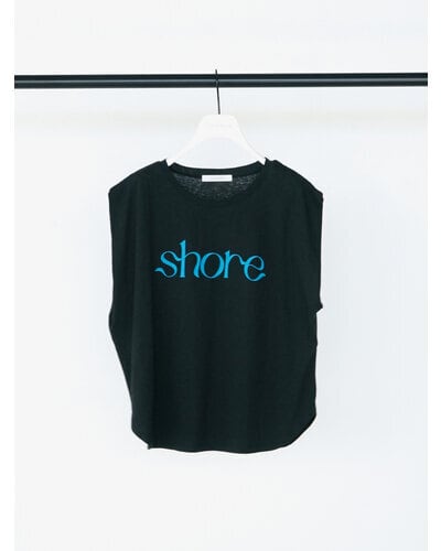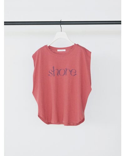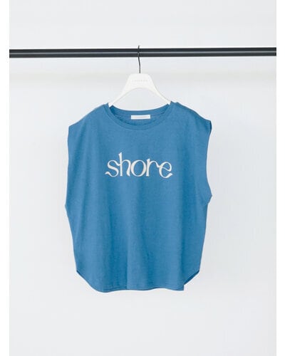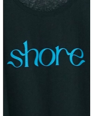 フロントに流れるようなロゴ”SHORE”(海辺)をプリントし女性らしいプリントTに仕上がりました。シンプルながらもスタイリングのアクセントになる、1枚で着映えするデザイン。