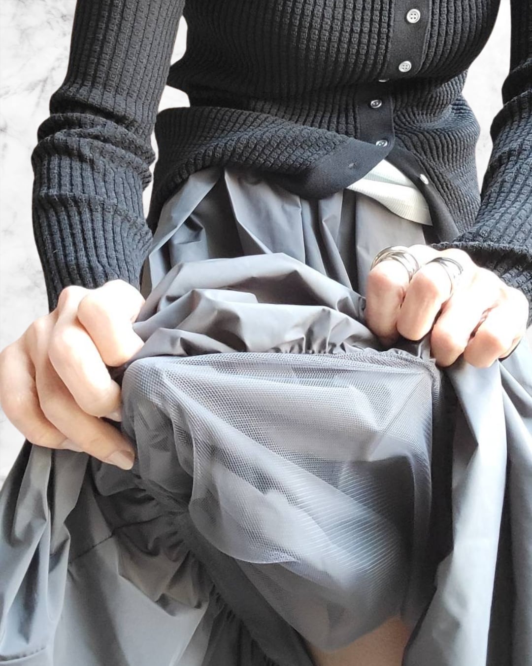 裏が通気性良いメッシュ素材の、とても軽くふんわりとしたシルエットのバルーンスカート