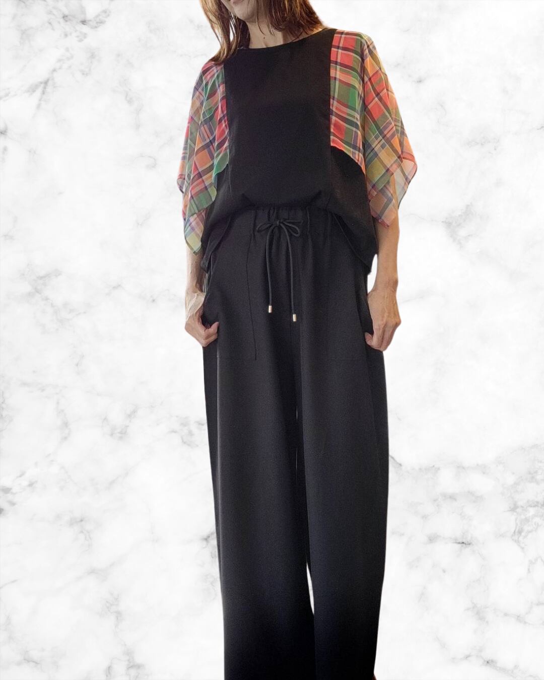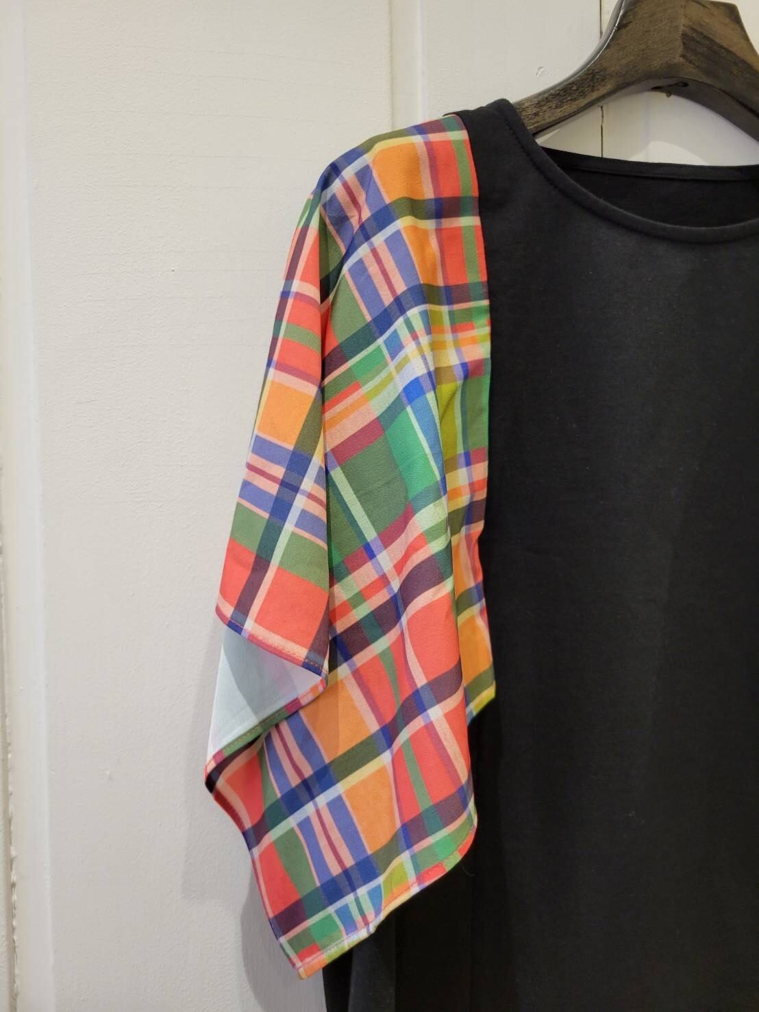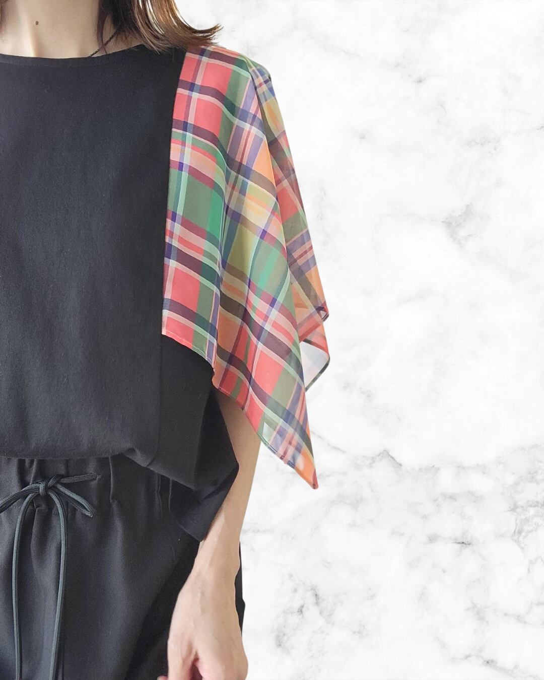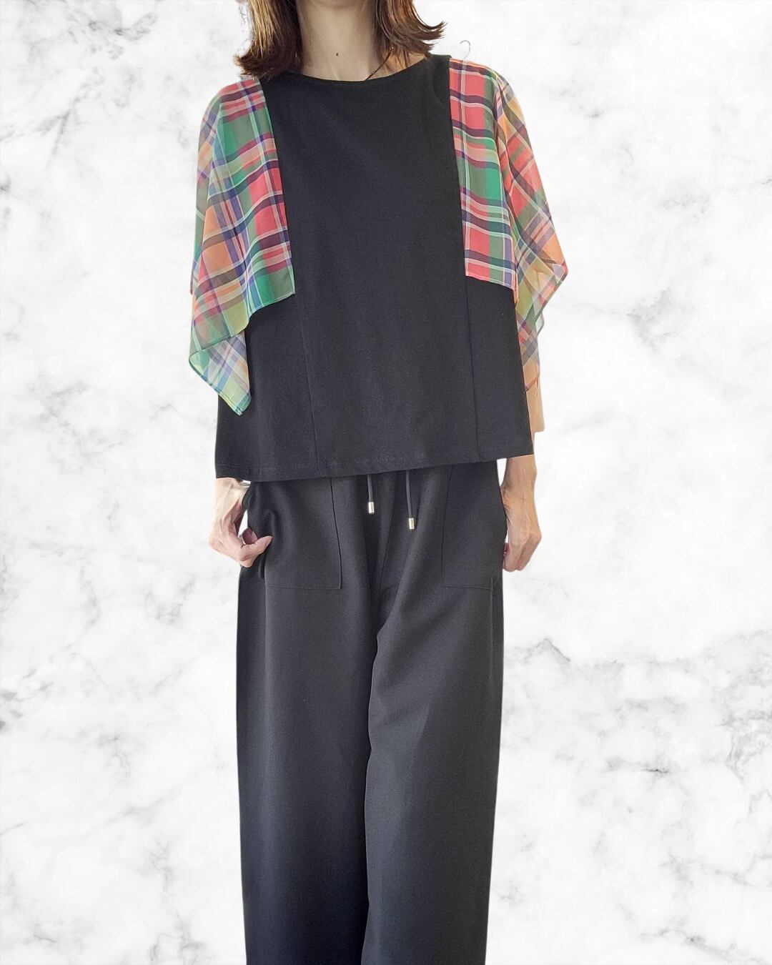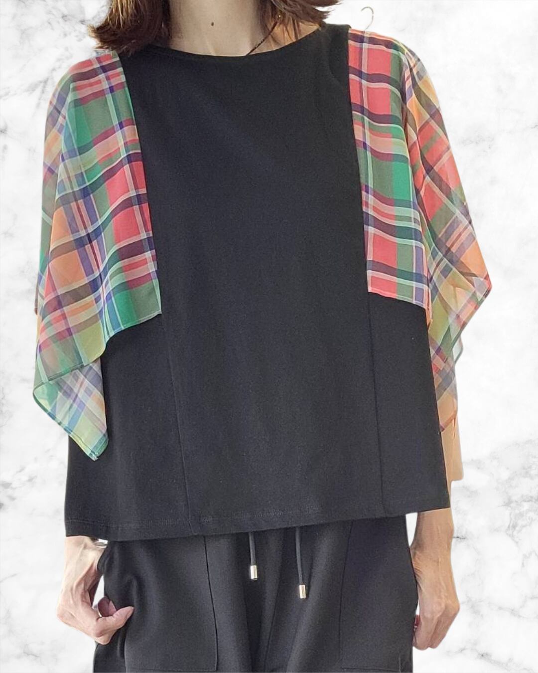 シンプルなブラックのタンクトップに、軽く華やかなチェック生地を半袖に見立てた爽やかな印象の一枚
