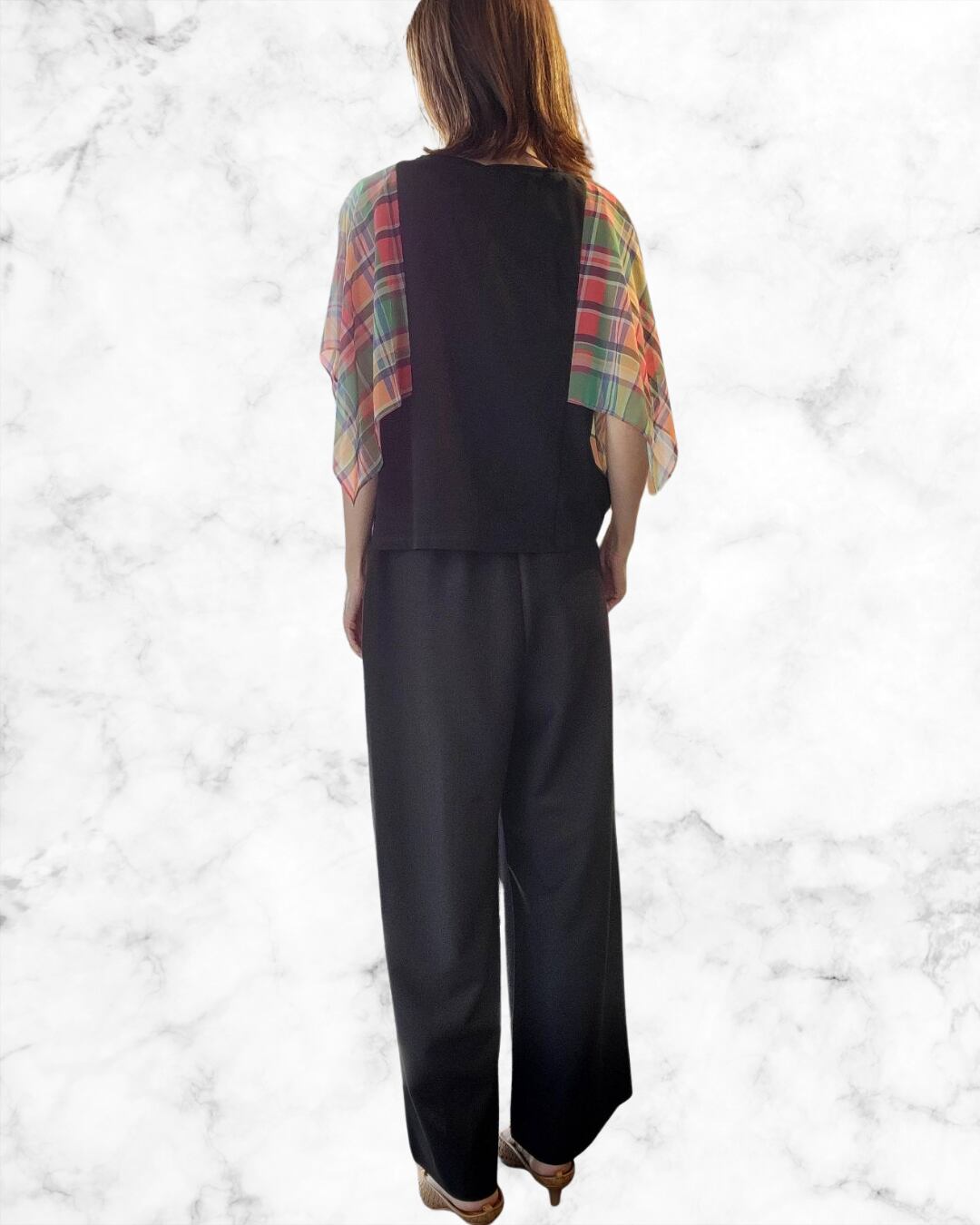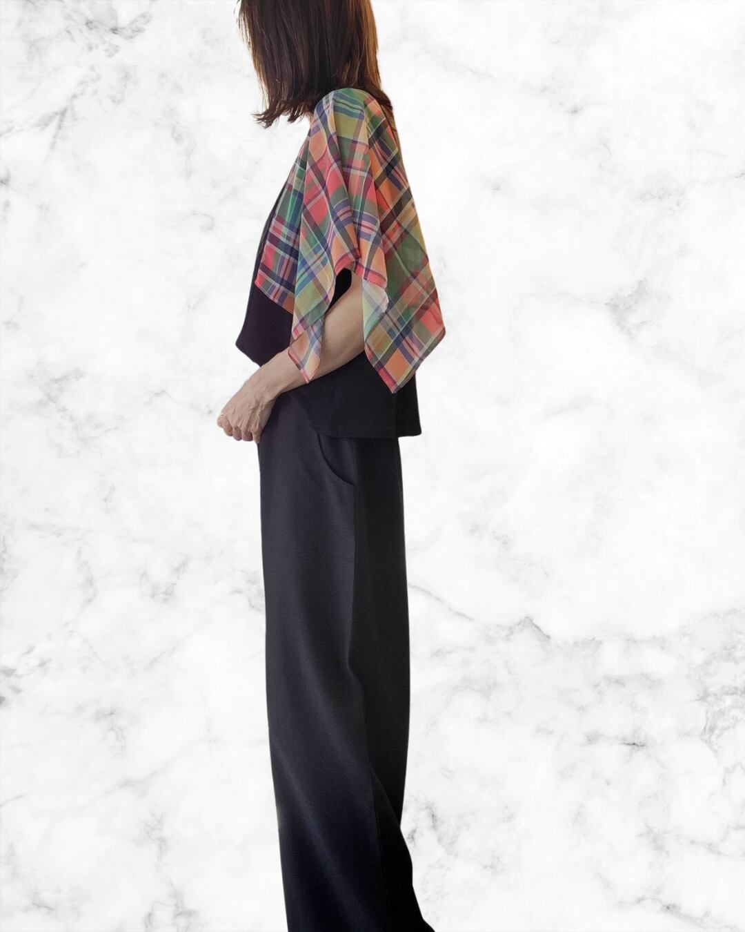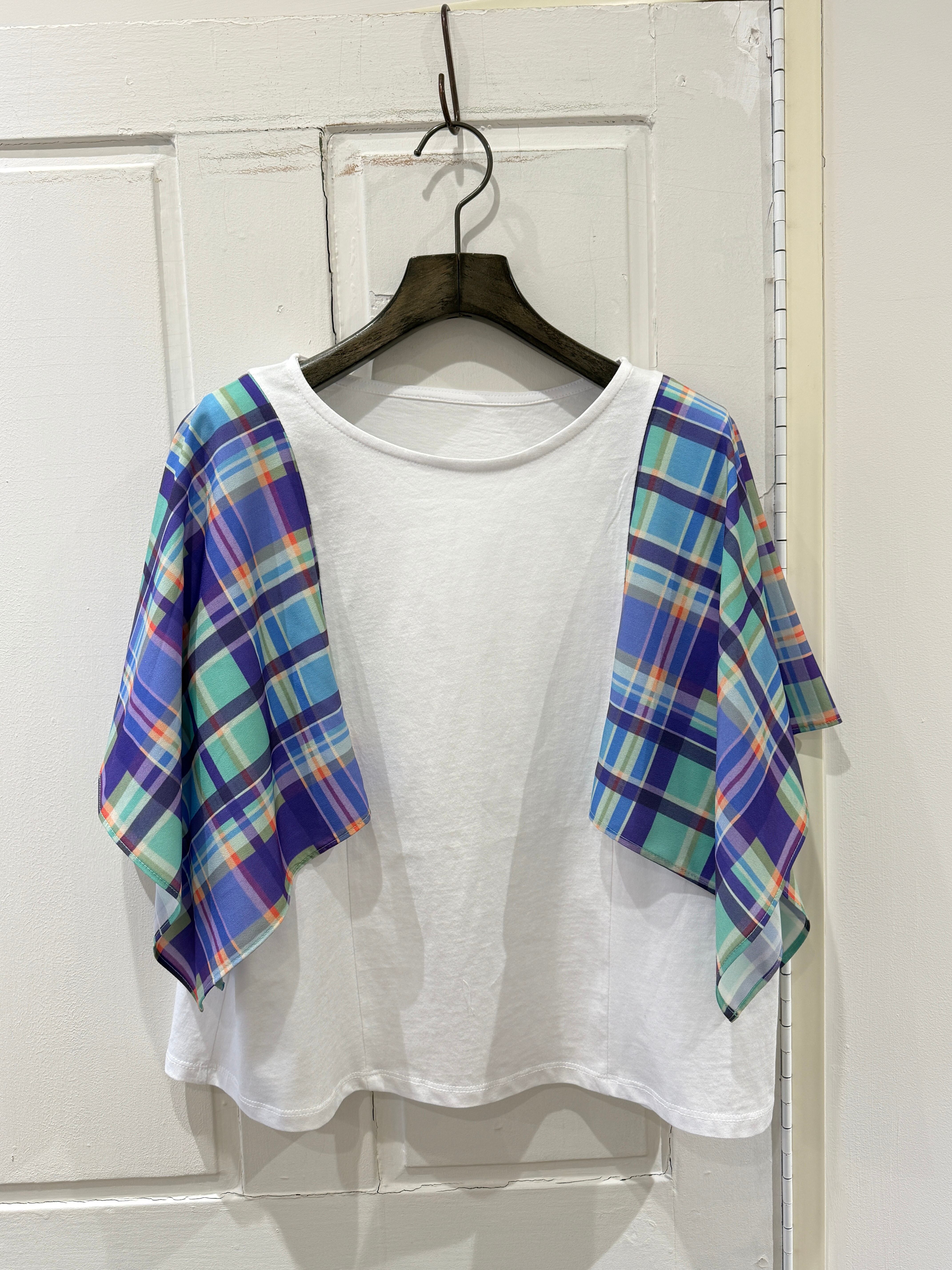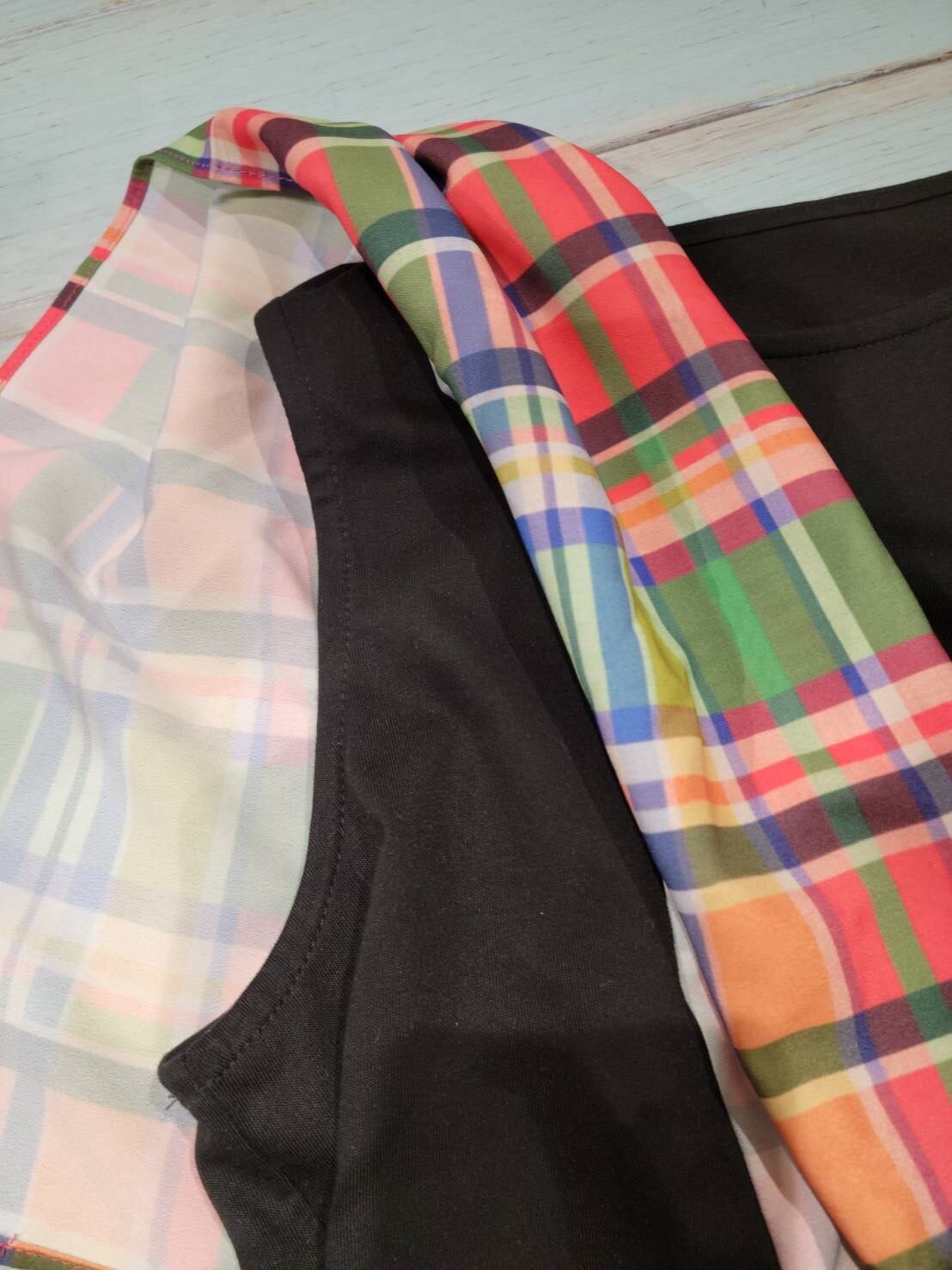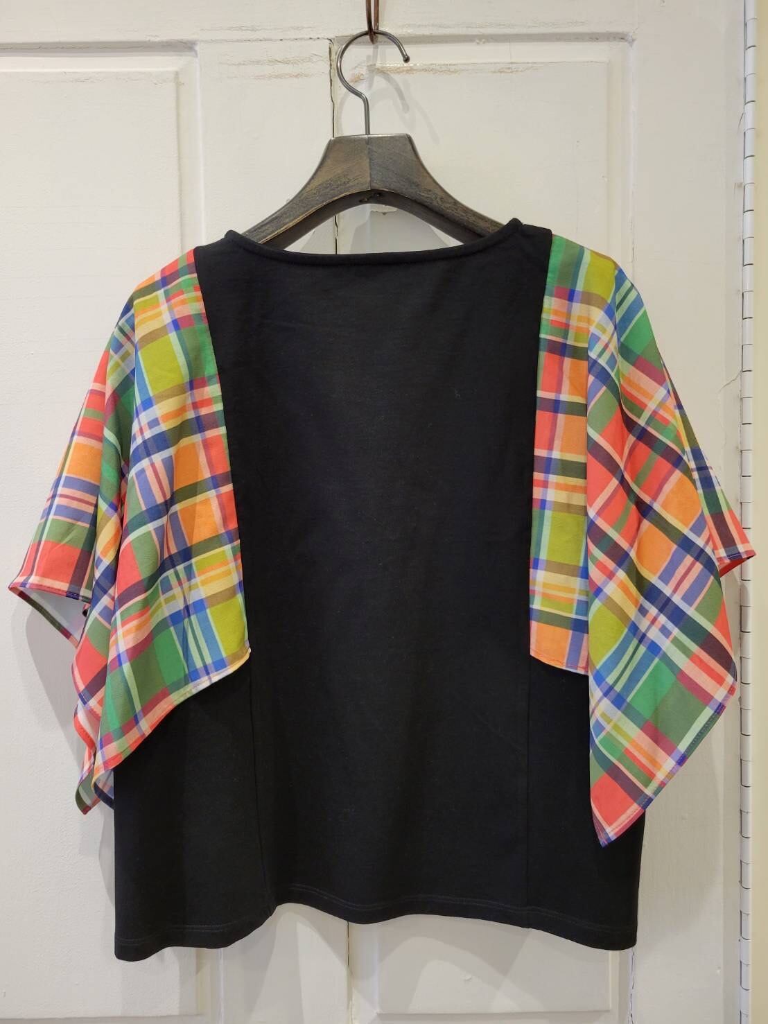 シンプルなブラックのタンクトップに、軽く華やかなチェック生地を半袖に見立てた爽やかな印象の一枚