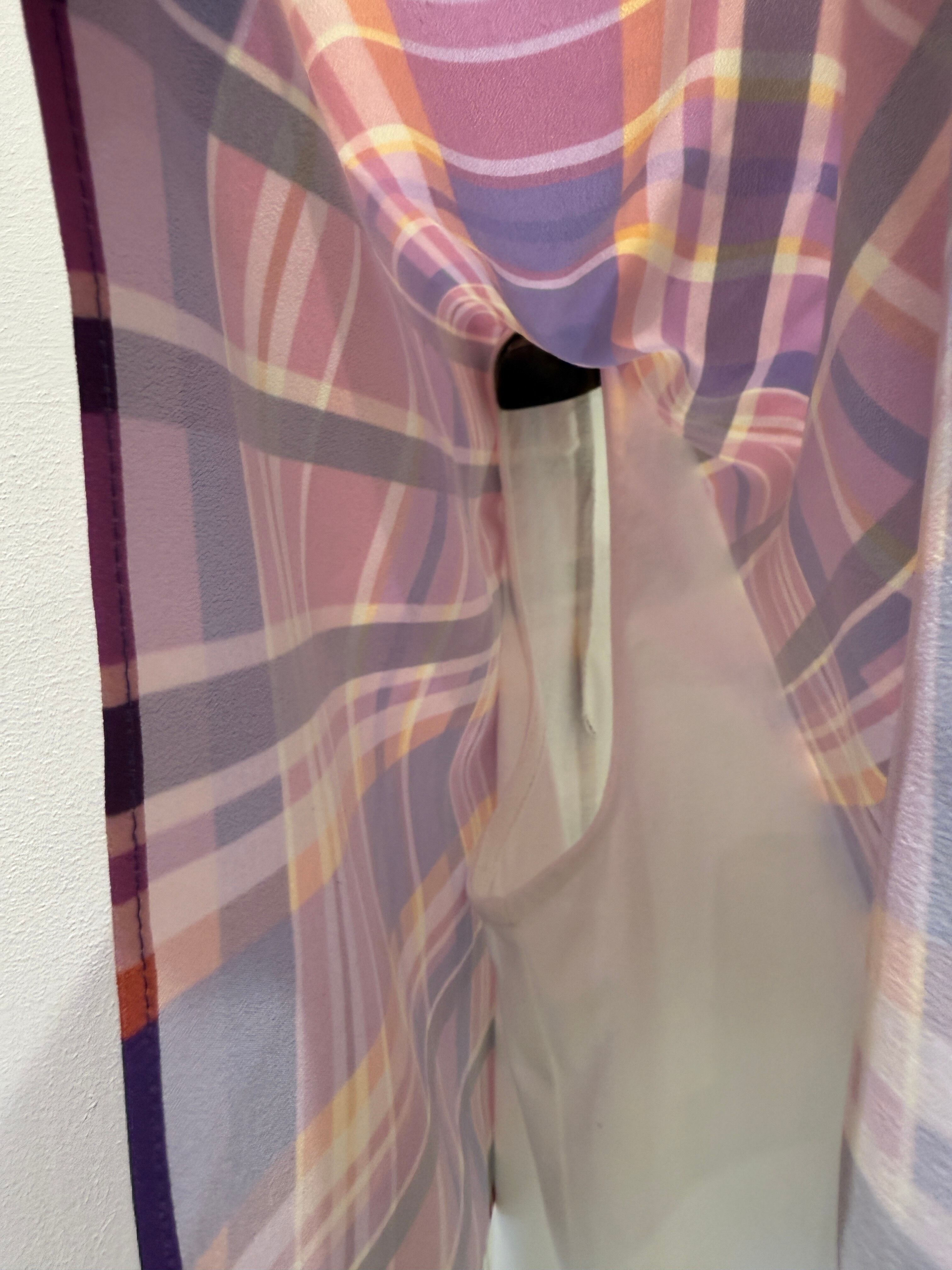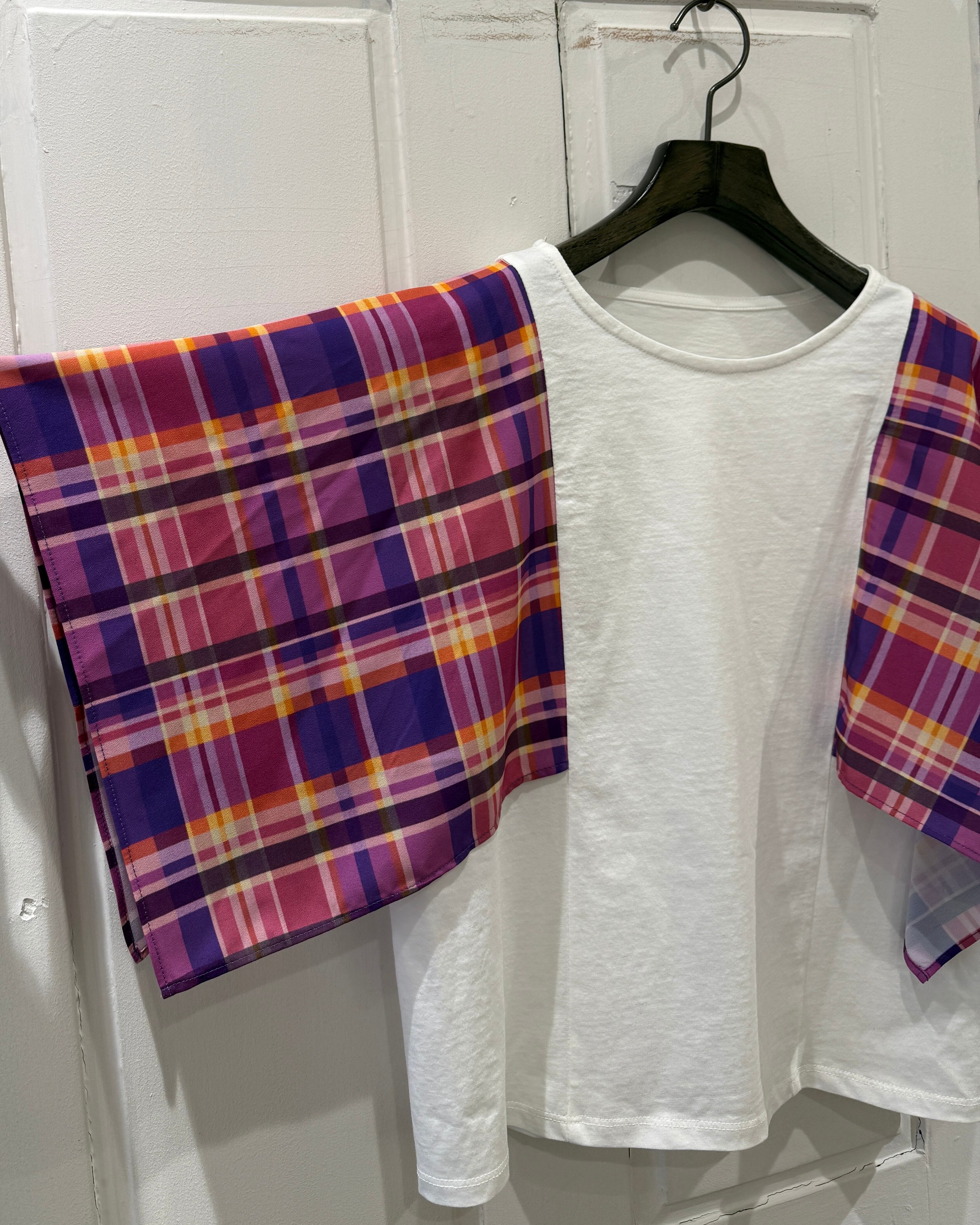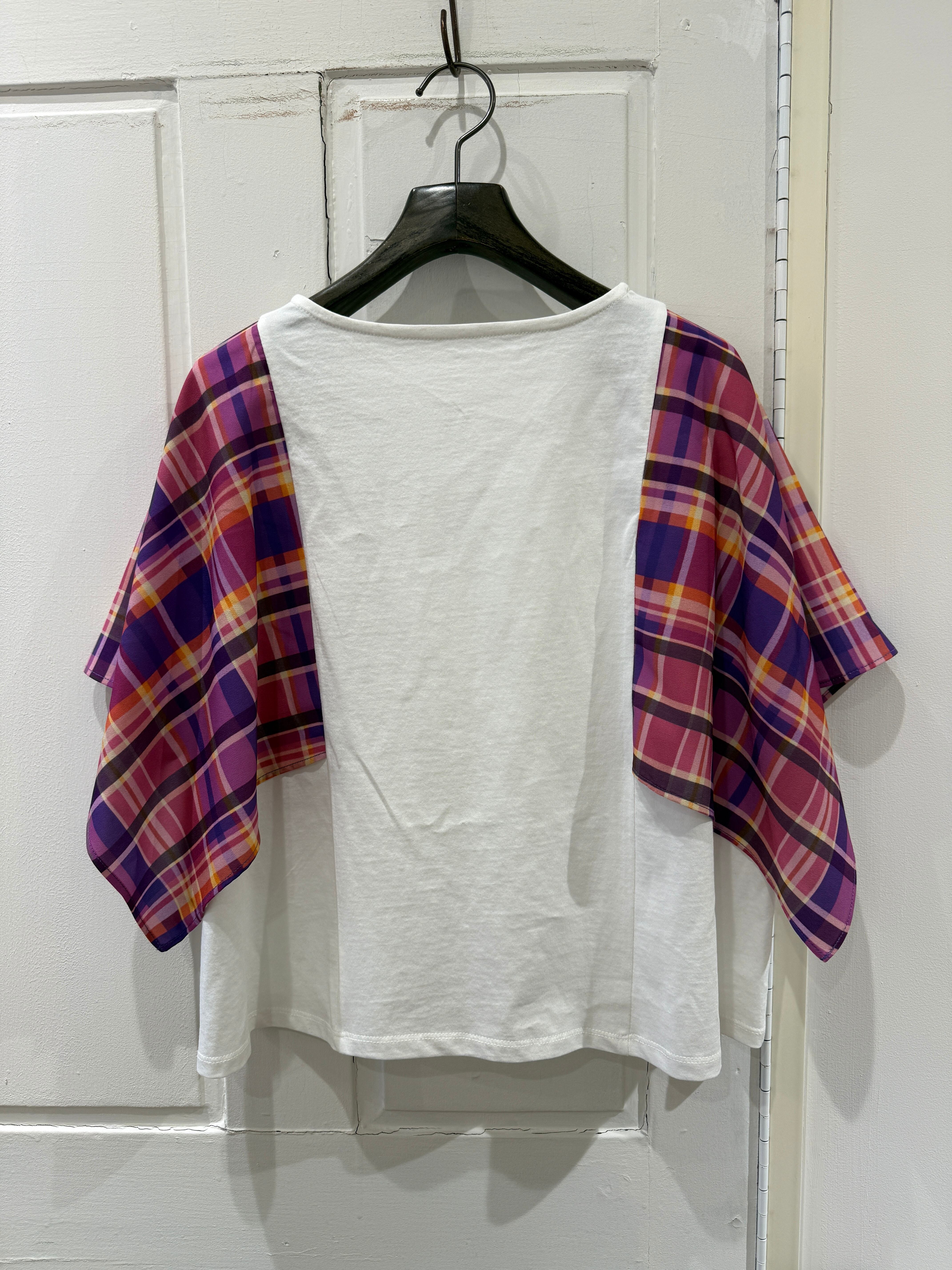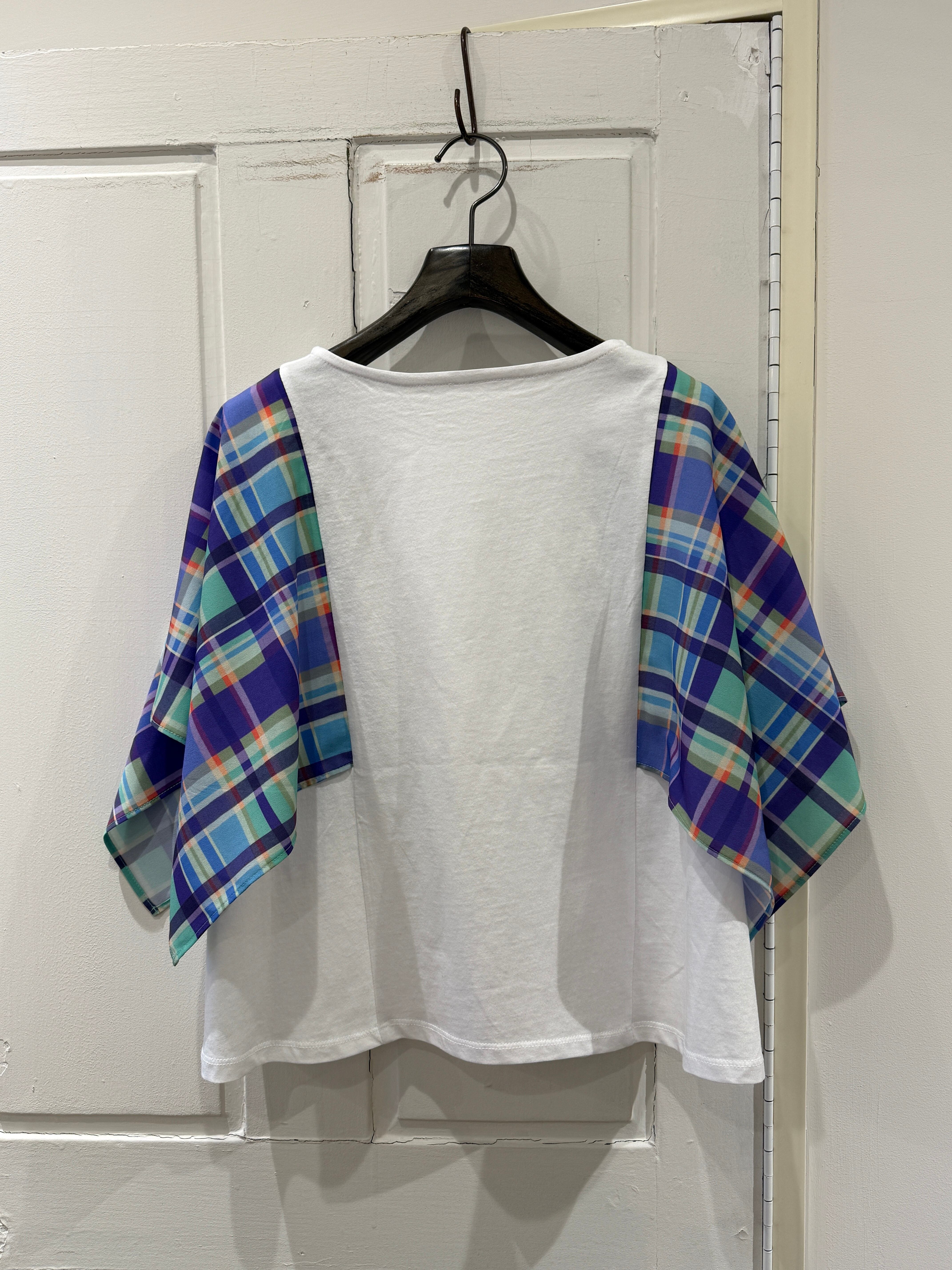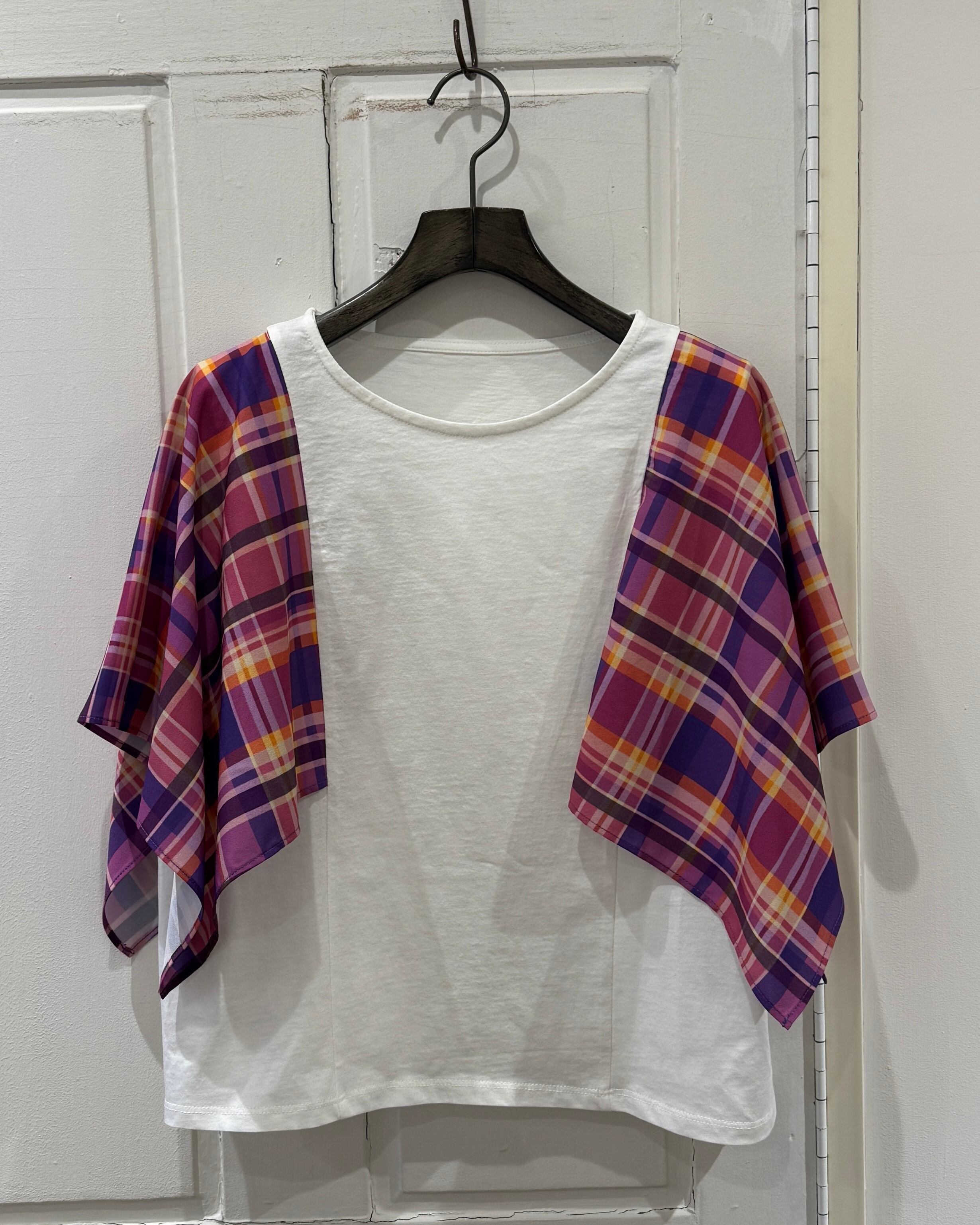 シンプルなブラックのタンクトップに、軽く華やかなチェック生地を半袖に見立てた爽やかな印象の一枚