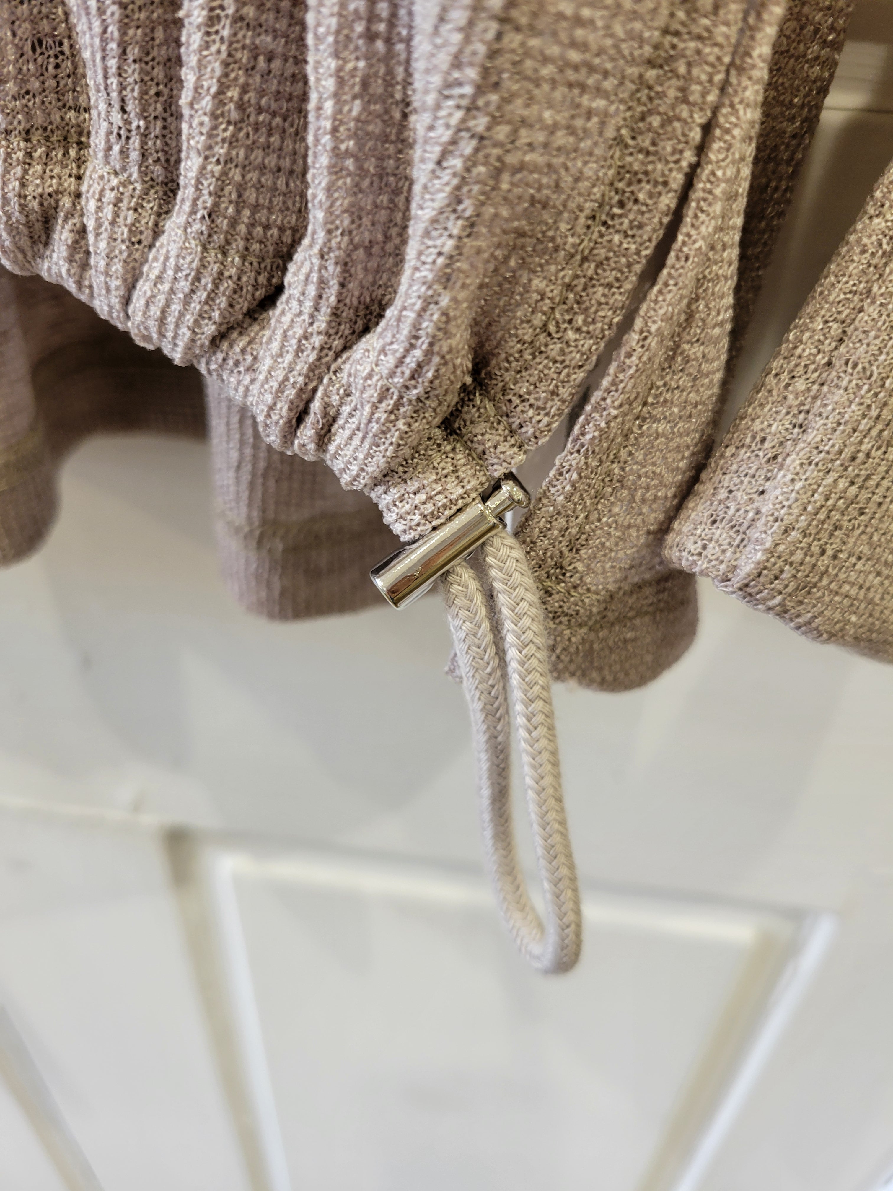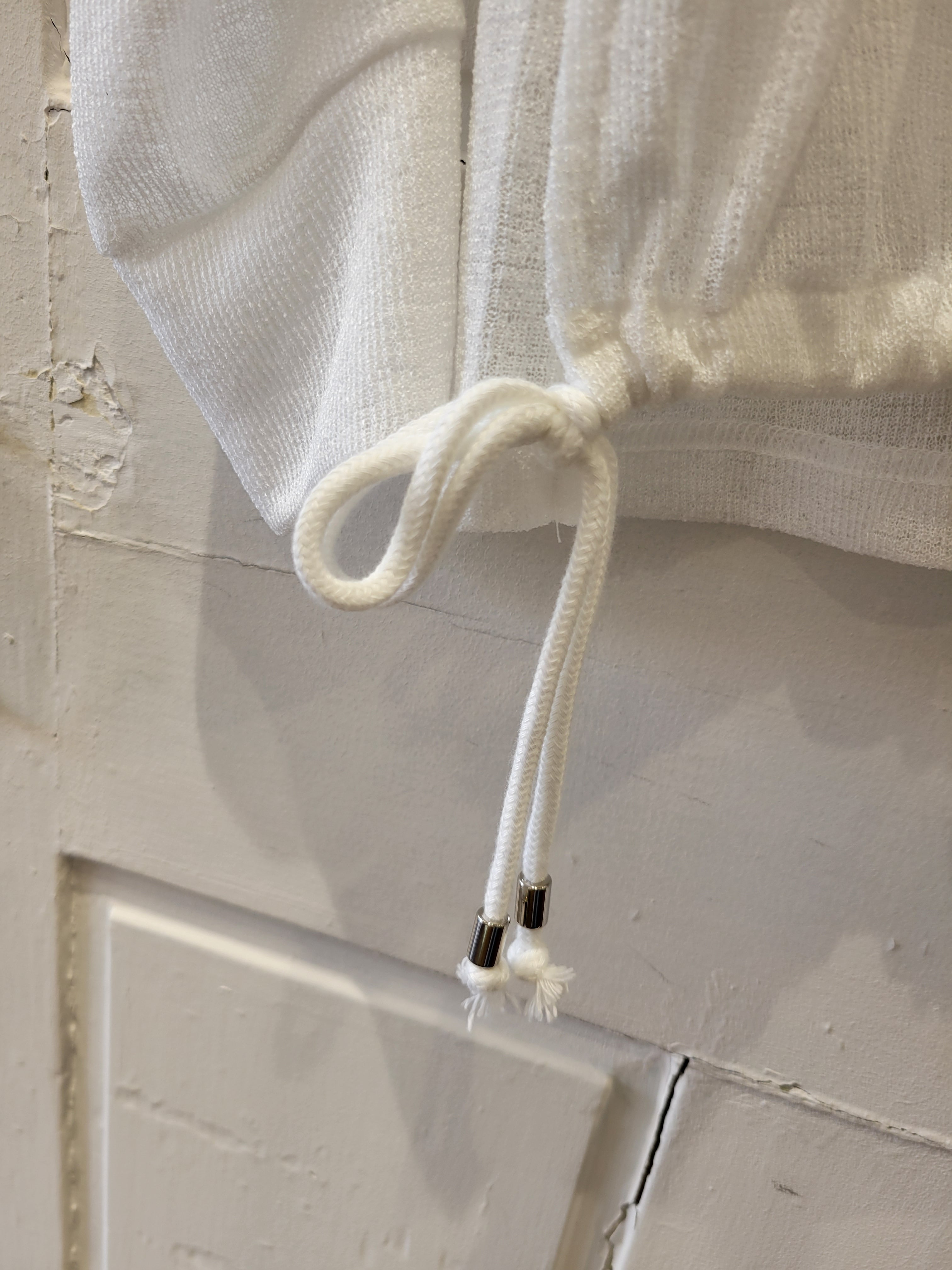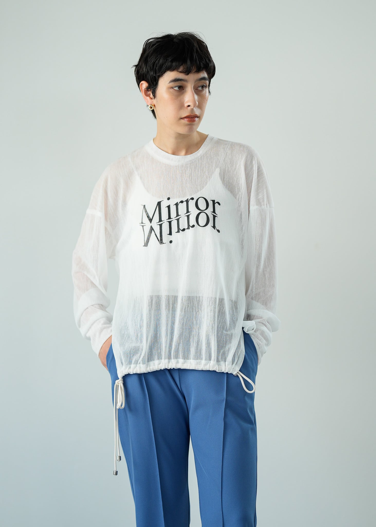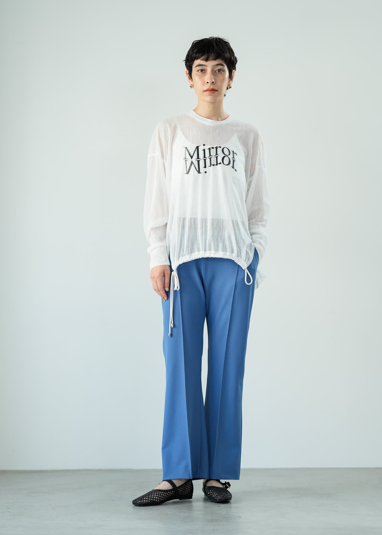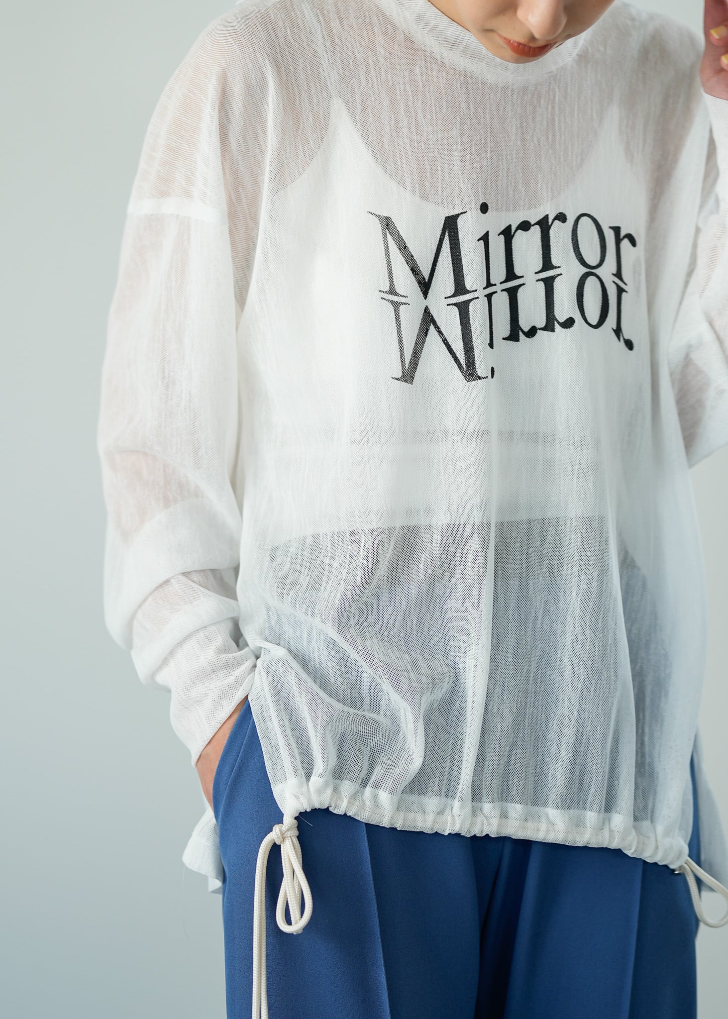裾のドロストを絞ってシルエットに変化をつけることもでき、シアーアイテムも立体的なLallia Mu'らしいこだわりの一枚。