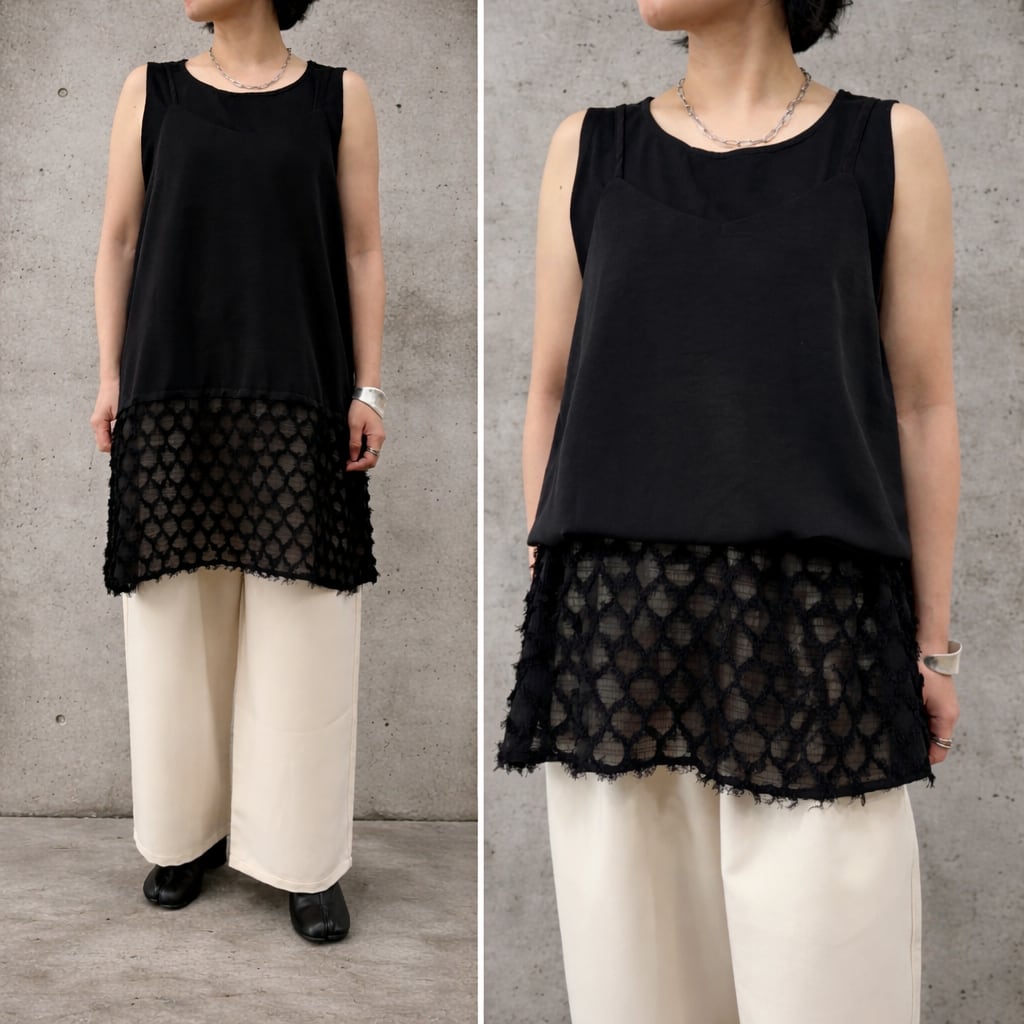 ウエスト部分にドローコードが入っていて、ブラウジングすることで、丈の長さを調節でき、上から着るトップスのサイズ感を問わず、レイヤードスタイルをお好みに調整できる万能なキャミソールです。また、前後着用も可能で片側にはスリットが入っていて多様なレイヤードスタイルを楽しんでいただけます。